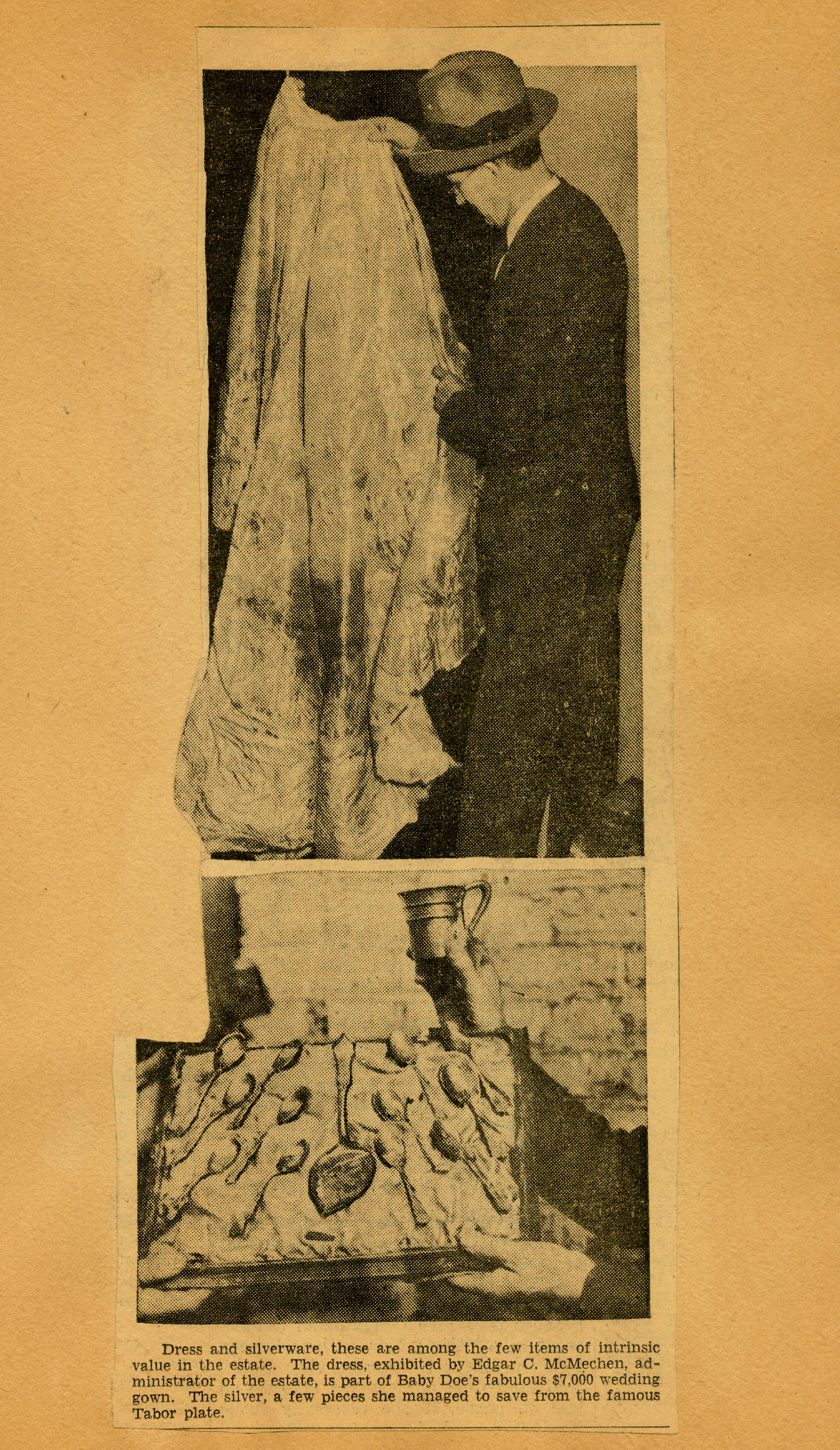 Unlabeled newspaper clipping depicting the rediscovery of Elizabeth Tabor’s wedding gown after her death.