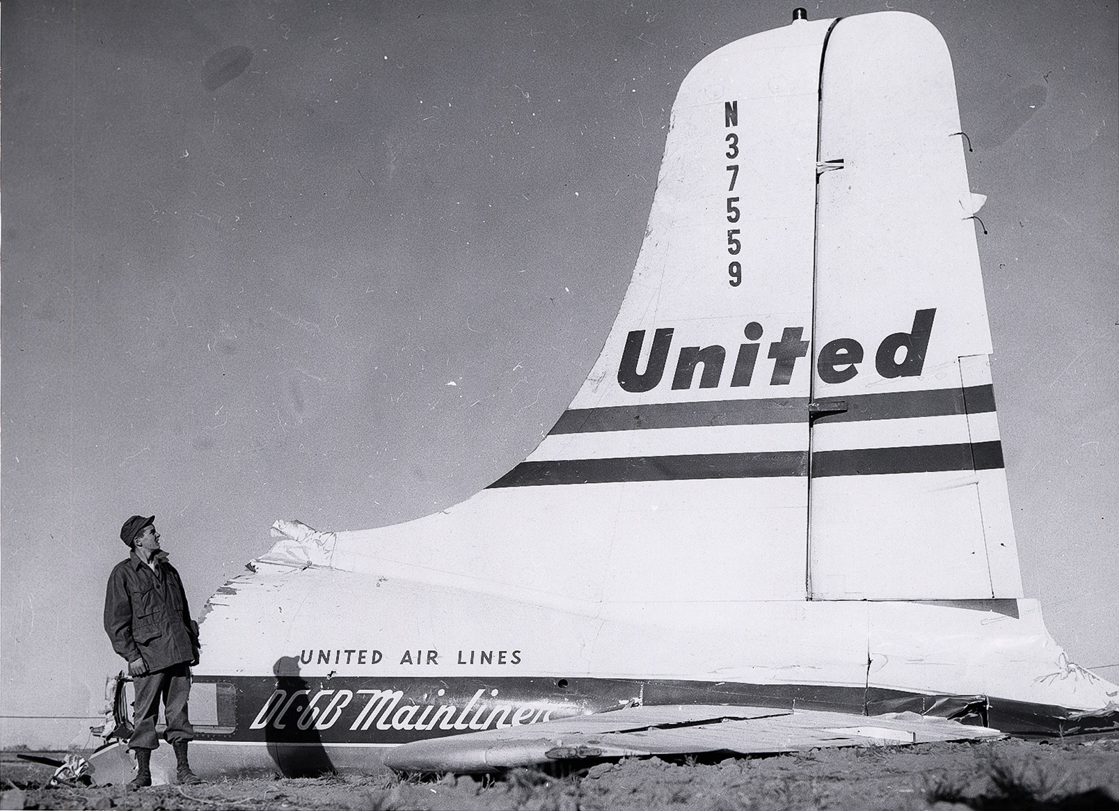 A man next to the destroyed tail section of Flight 629 in the field, photographed for the Rocky Mountain News.