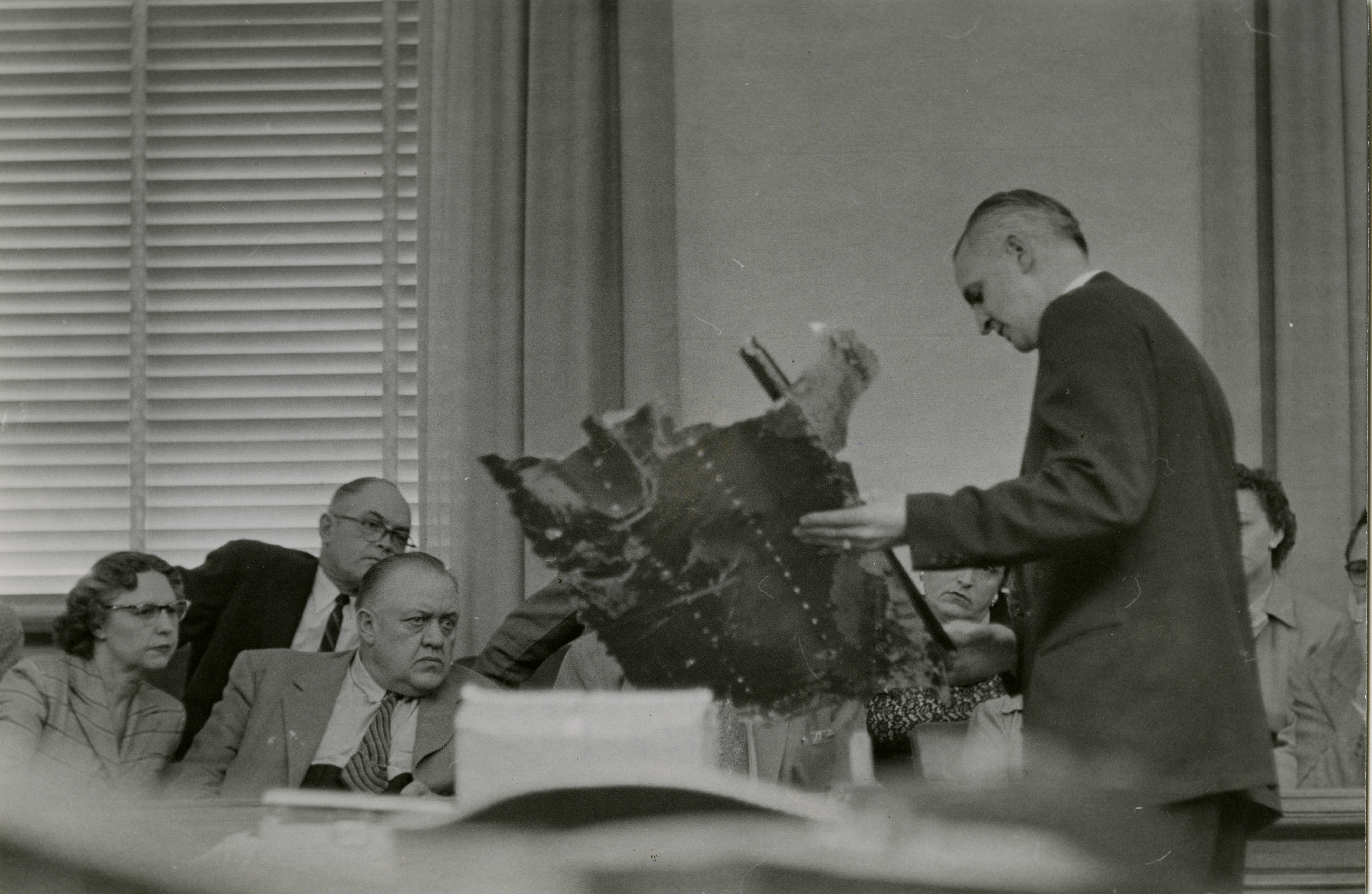 Dr. J. William Magee displaying metal to the jury during the trial of John Gilbert Graham.