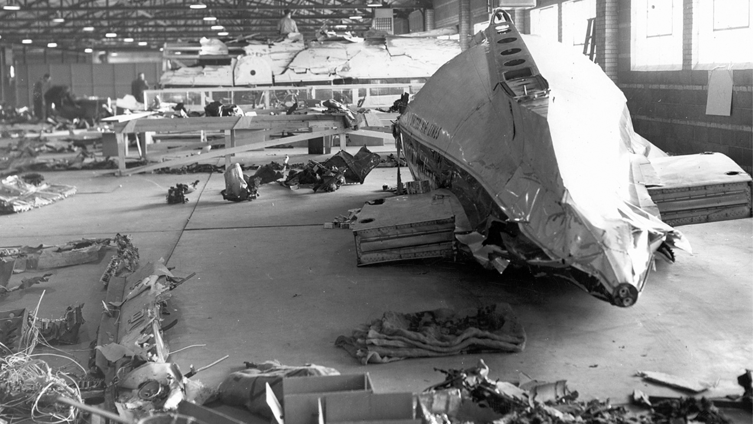 As part of the investigation, the wreckage of Flight 629 was collected and organized in a hangar so all the pieces could be examined in relation to each other.