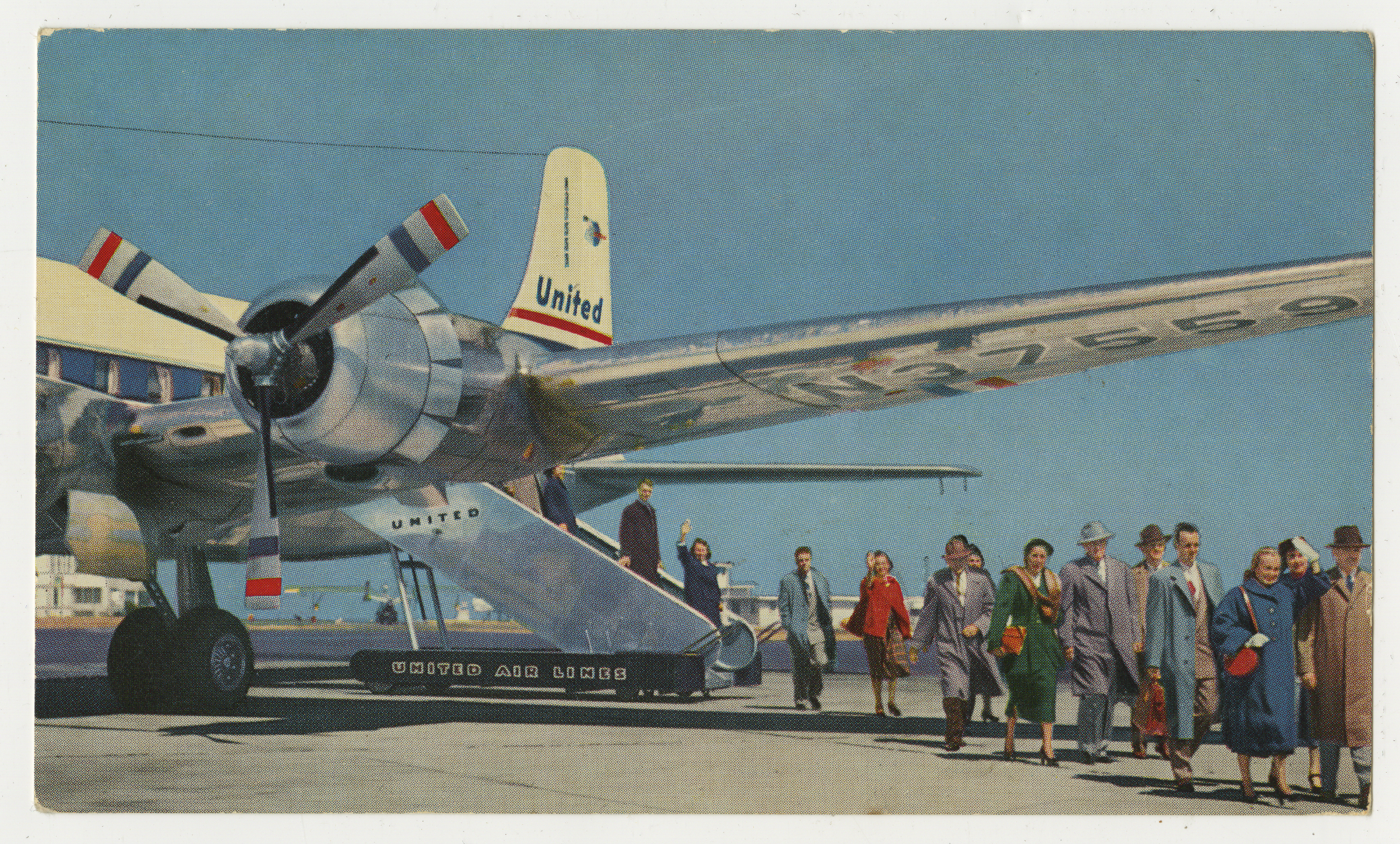 United Air Lines photo postcard showing passengers disembarking from Mainliner Denver, the plane destroyed in the bombing of Flight 629.
