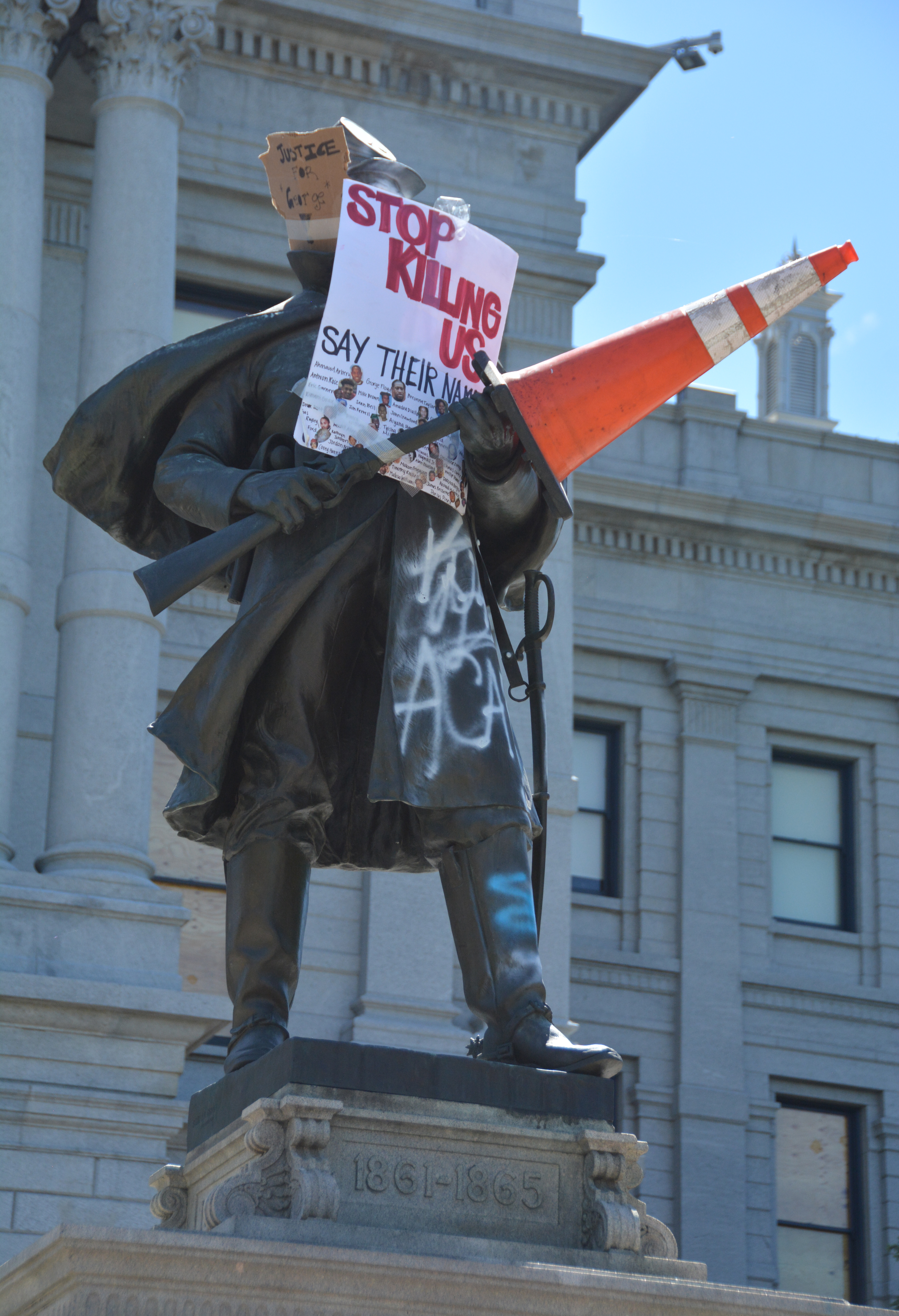 The Colorado State Capitol Civil War monument vandalized during the 2020 protests, with a sign that reads "Stop Killing Us."
