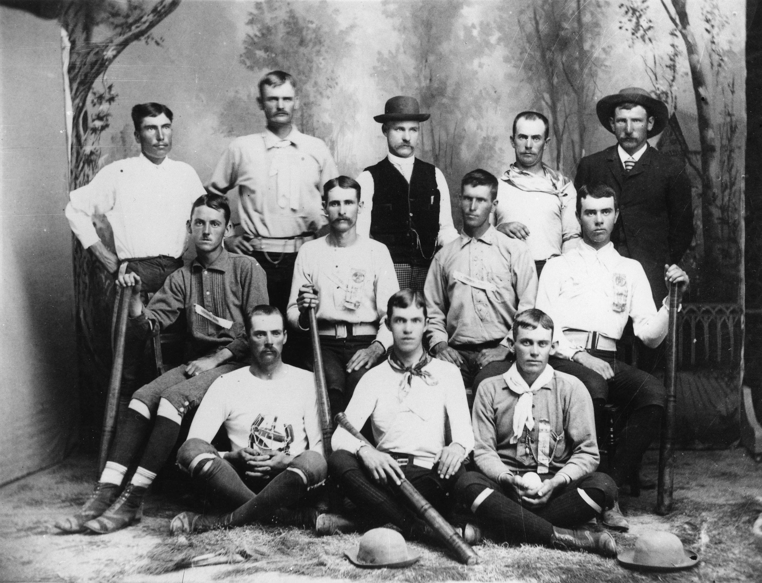 Berthoud team, about 1880. Back row, from left: Ben Turner (right field), George Kiernes (left field), George Graham (first base), Frank Fenron (center field), Josh Barr (chief booster or promoter). Middle row, from left: Fred Richardson (second base), Jap Pulliam (utility), Bill Turner (utility), Elmer Kay (utility). Front row, from left: Bill Fenton (center), Amos Mahon (shortstop), Bob Richards (pitcher).