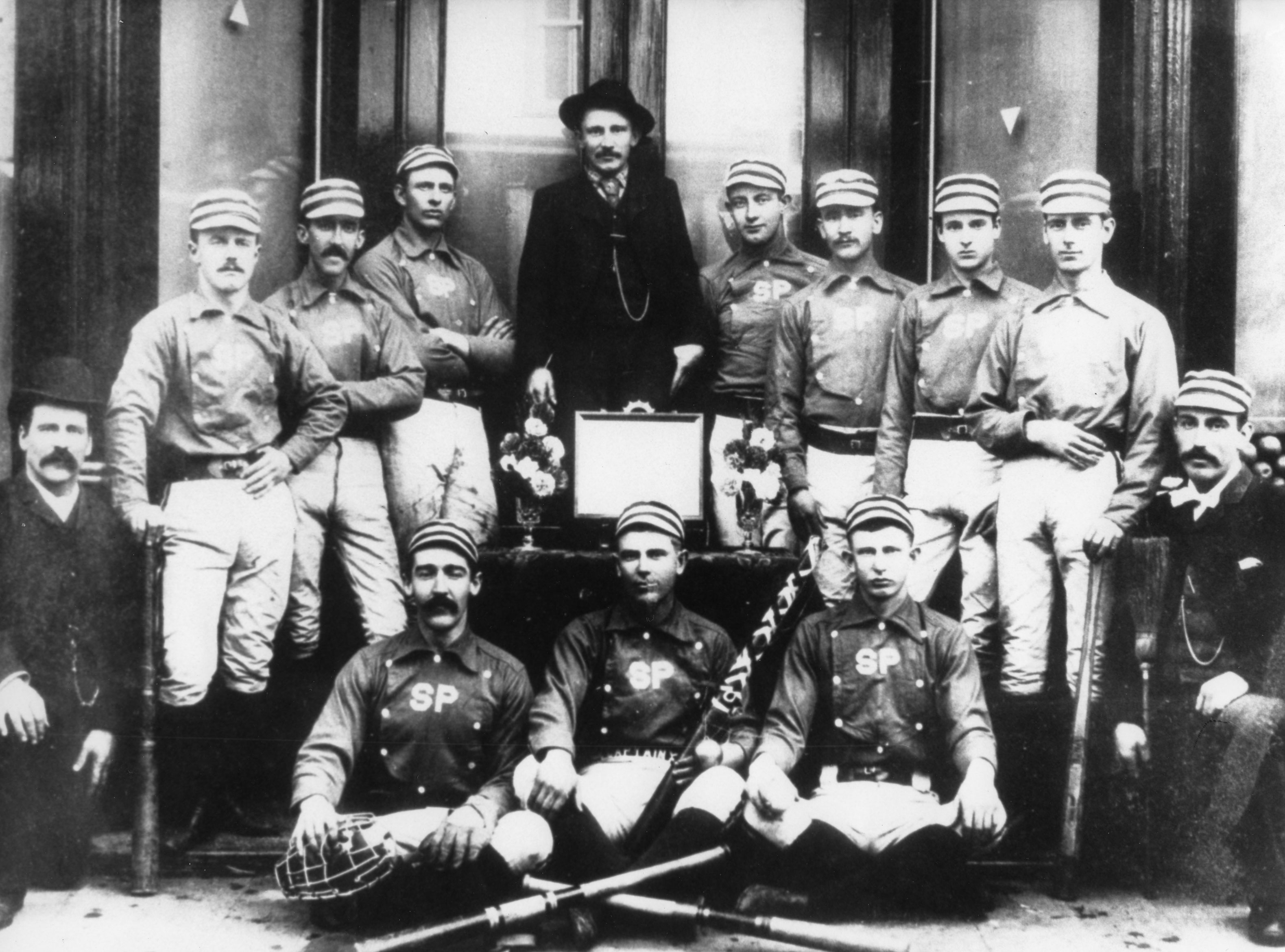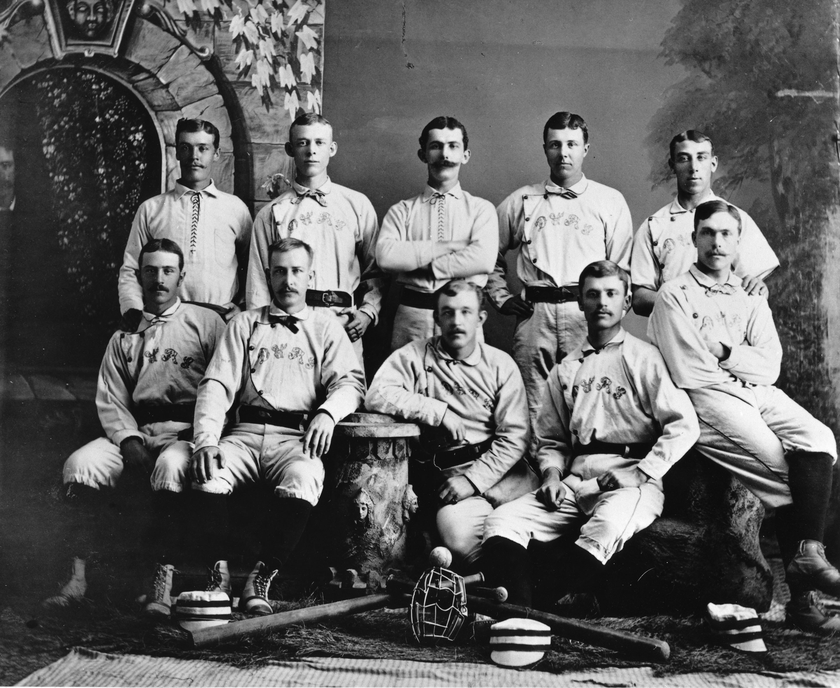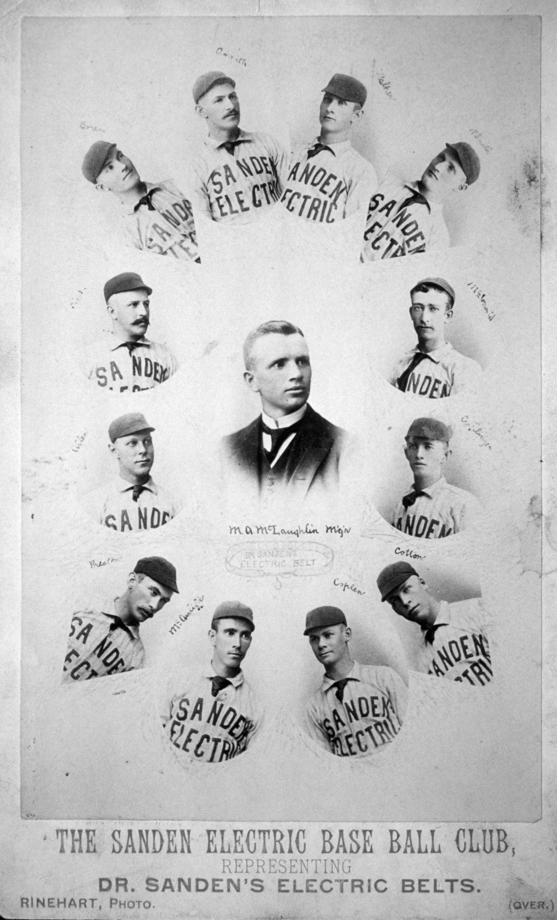 The Sanden Electric Base Ball Club, representing Dr. Sanden’s Electric Belts, Denver, 1891. Photo by Rinehart, Denver. Pictured are team manager M. A. McLaughlin and players: Caplen (pitcher), Cotton (catcher), Little (first base), McAuliffe (second base), Walter Preston (third base; played Major League Baseball), Allen (shortstop), Pink (left field), McLaughlin (center field), and Walker (right field).