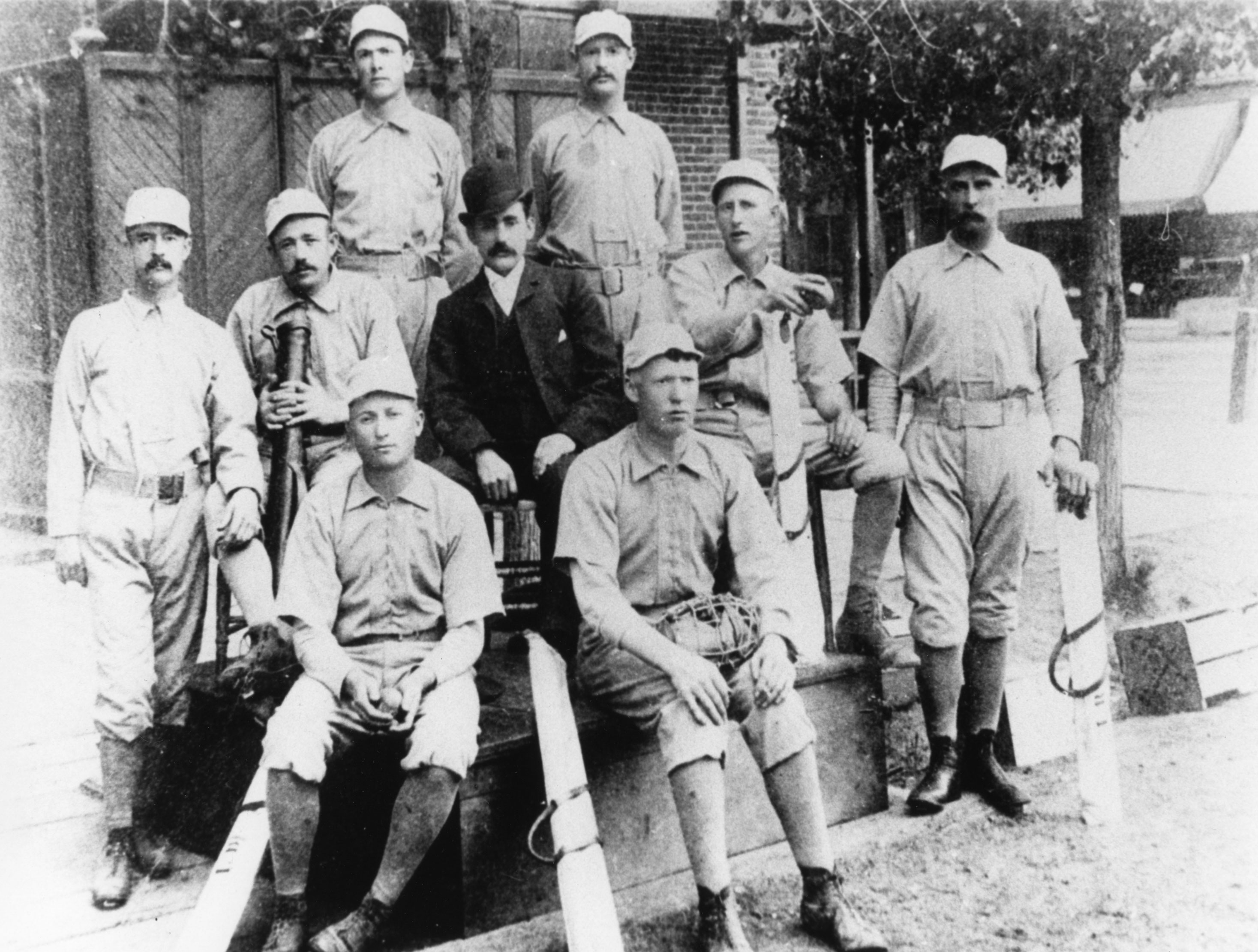 Leadville Blues, Leadville, 1888. Players include Marshal “Butch” Blake (first base and manager), Dawson (center field), Dolan (left field), Warren “Lefty” Fitzgerald (pitcher; front row, left), John Foutz (shortstop), Green (right field), W. H. Hughes (third base), King (secretary; center, wearing street clothes), Orth (second base), Angus McDonald White (middle row, far left), and George Washington Whyte (catcher; front row, right).