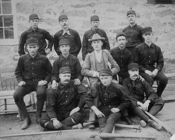 Nevadaville team, 1890–1900. The gold-mining town known as Nevadaville or Nevada City was founded south of Central City in 1859. Little remains of the town today. Pictured are: Chalmar Rutherford, I.D.W. (possibly W.D.) Stevens, William Simmons, William J. Richards, Charles Workmaster, William O. Jenkins, Fred S. Bolsinger, and John Chapple (mascot/batboy). Photo by A. M. Thomas. 98.76.2