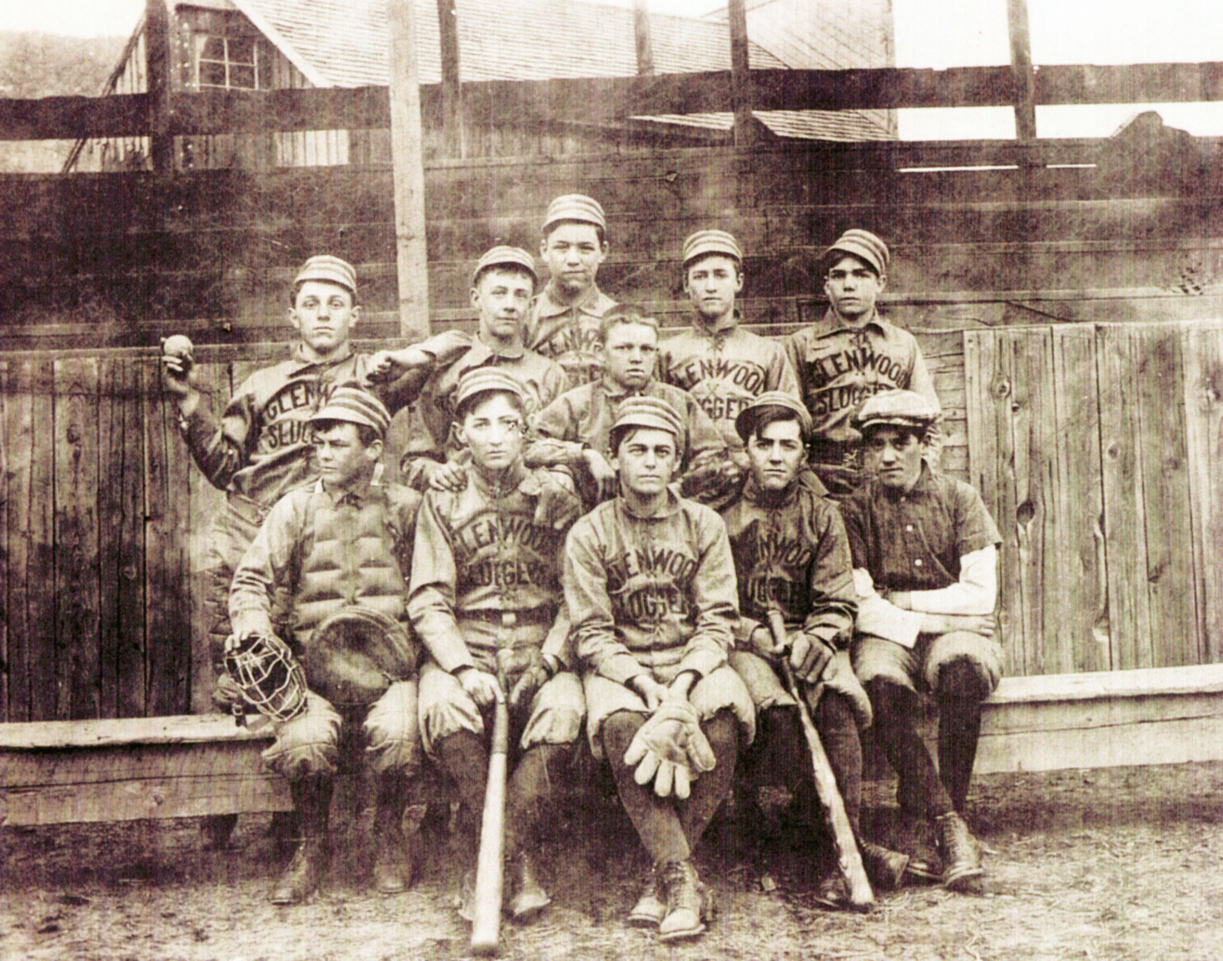 Glenwood Springs team the Glenwood Sluggers, 1902. Pictured, standing, from left: Ed Everett, Charles Hughes, Jim Ford, Tom Baxter, Roy Reed. Standing, center: Sid Mangnall (mascot or batboy). Seated, from left: Oscar Smith, Carleton Hubbard, Ernest Barlow, John Thomas, Ben McCauley.