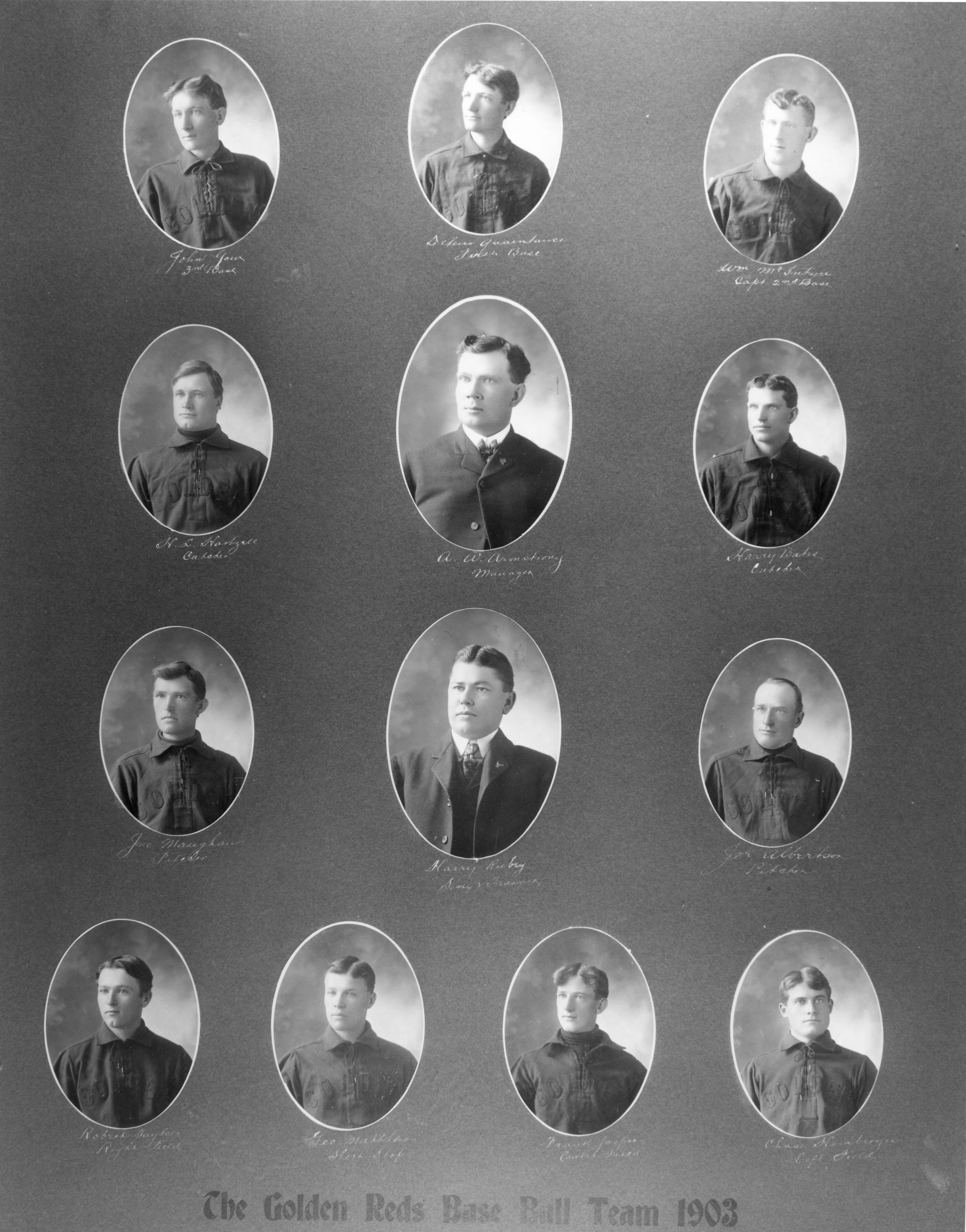 Golden Reds, 1903. Top row, from left: John Gow (third base), Defeus Quaintance (first base), William McIntyre (captain and second base). Second row, from left: H. Hartzell (catcher), A. W. Armstrong (manager), Harry Bates (catcher). Third row, from left: Joe Maughan (pitcher), Harry Rubey (secretary and treasurer), Joe Albert (pitcher). Bottom row, from left: Robert Taylor (right field), George Matthews (shortstop), Frank Jasper (center field), Charles Hambergar (left field).