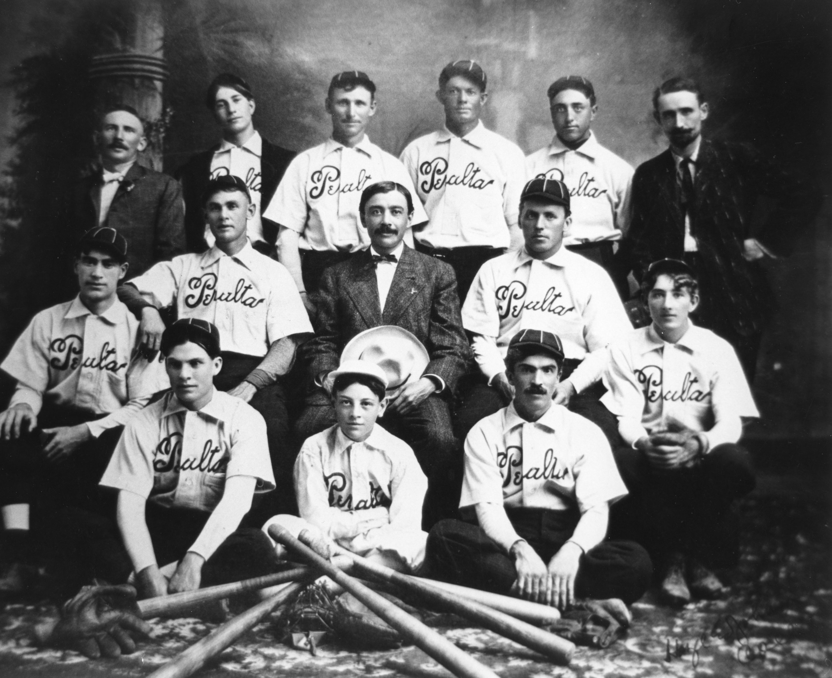 Peralta team, Greeley, about 1910, sponsored by Arthur A. Peralta (seated at center, holding a hat), superintendent of Great Western Sugar Company.