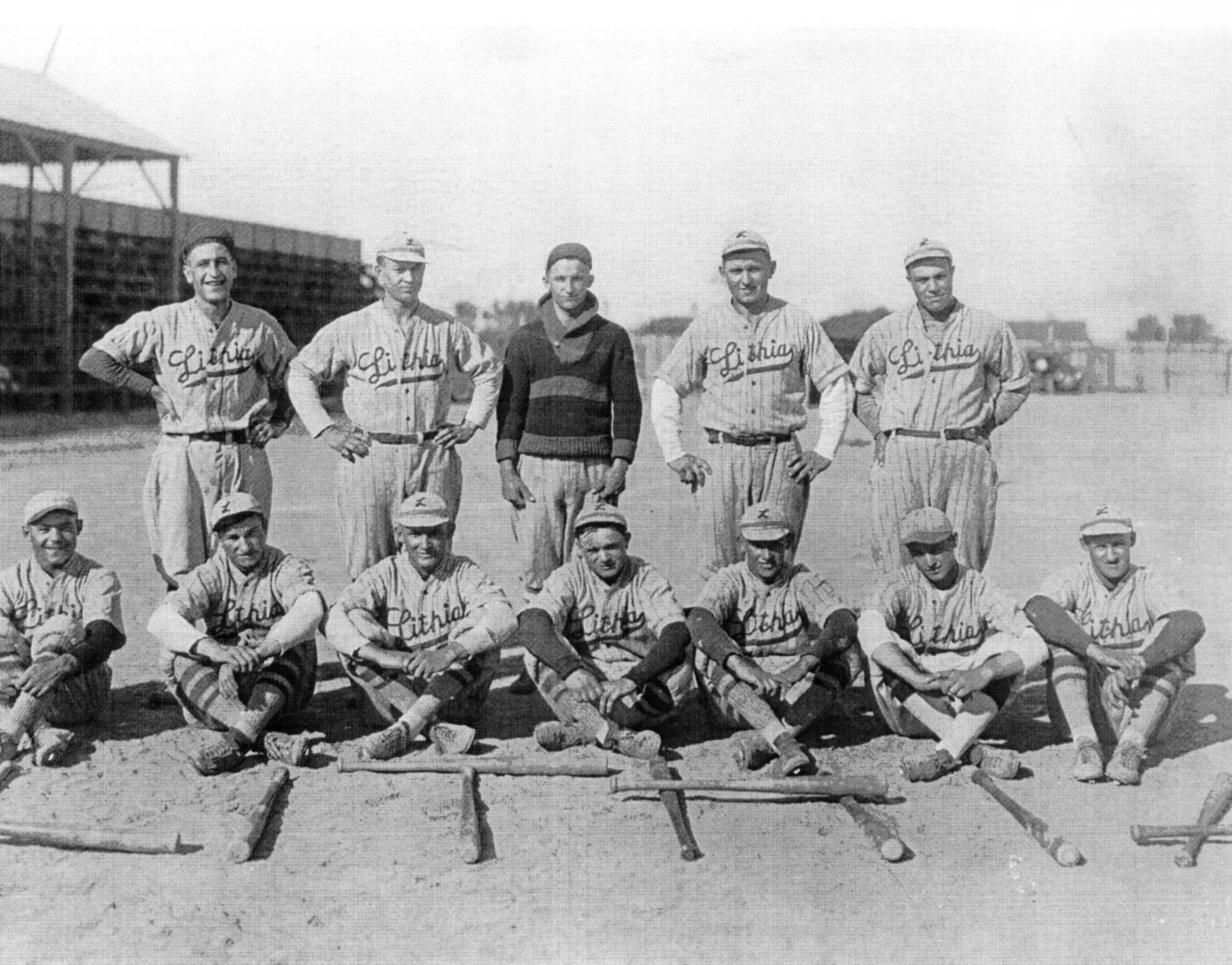 Lithia Ball Club (with bats arranged to spell Lithia), sponsored by the Lithia Water Bottling Company, Pueblo, 1913.