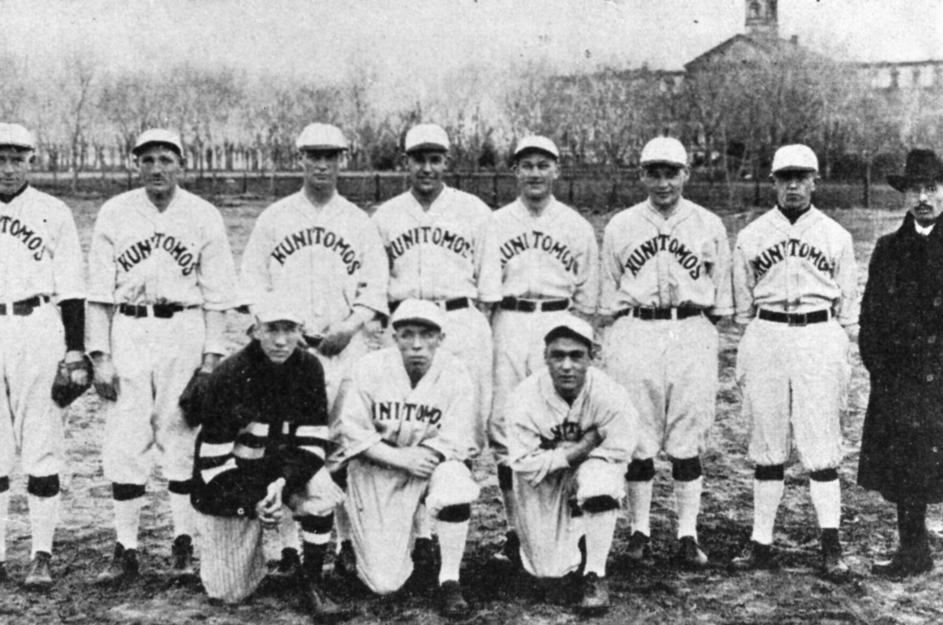 Kunitomos team, Denver, 1920. Standing, from left: Duncan, Sullivan, Walker (captain), Olson, Rector, Famularo, unknown, Dr. Kunitomo. Kneeling, from left: Anthony Kunitomo, McDonald, Williams.