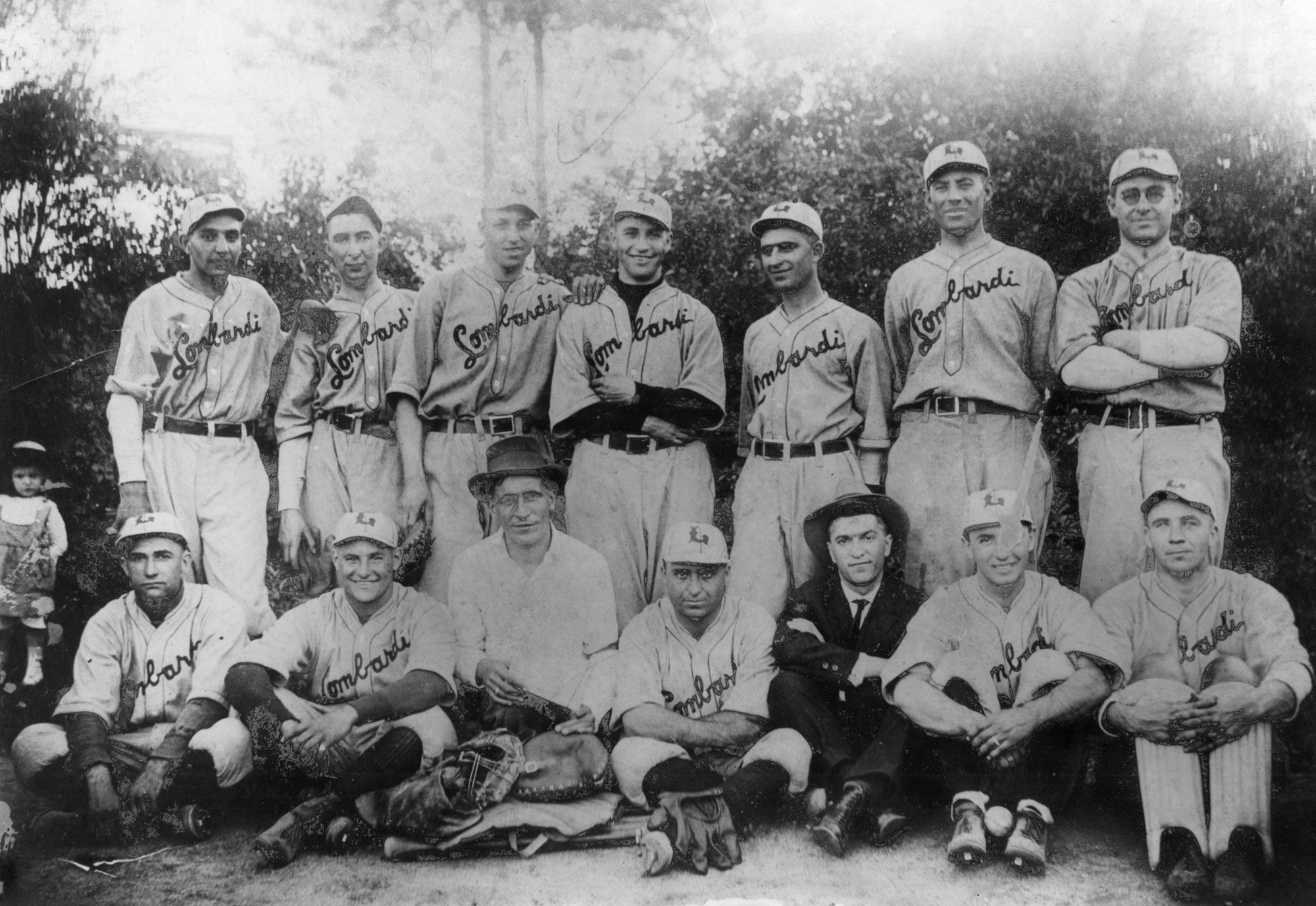 Lombardi Billiard Hall team, Denver, about 1925. Back row, from left: Tom Lombardi (right field), F. Burns (third base), P. Villano (first base), M. Villano (team captain and center field), L. LaBate (second base), G. LaBate (pitcher), K. Quintana (pitcher). Front row, from left: R. C. Lansville (second base and short stop), L. “Slugger” Tolve (left field), Pipp Lombardi (scorekeeper), Salvatore “Tex” Route (shortstop), Pasquale Lombardi (team backer, owner of Lombardi Billiard Hall, 1400 West Thirty-Seventh Avenue), J. LaBate (team co-backer), Webber (catcher and coach).