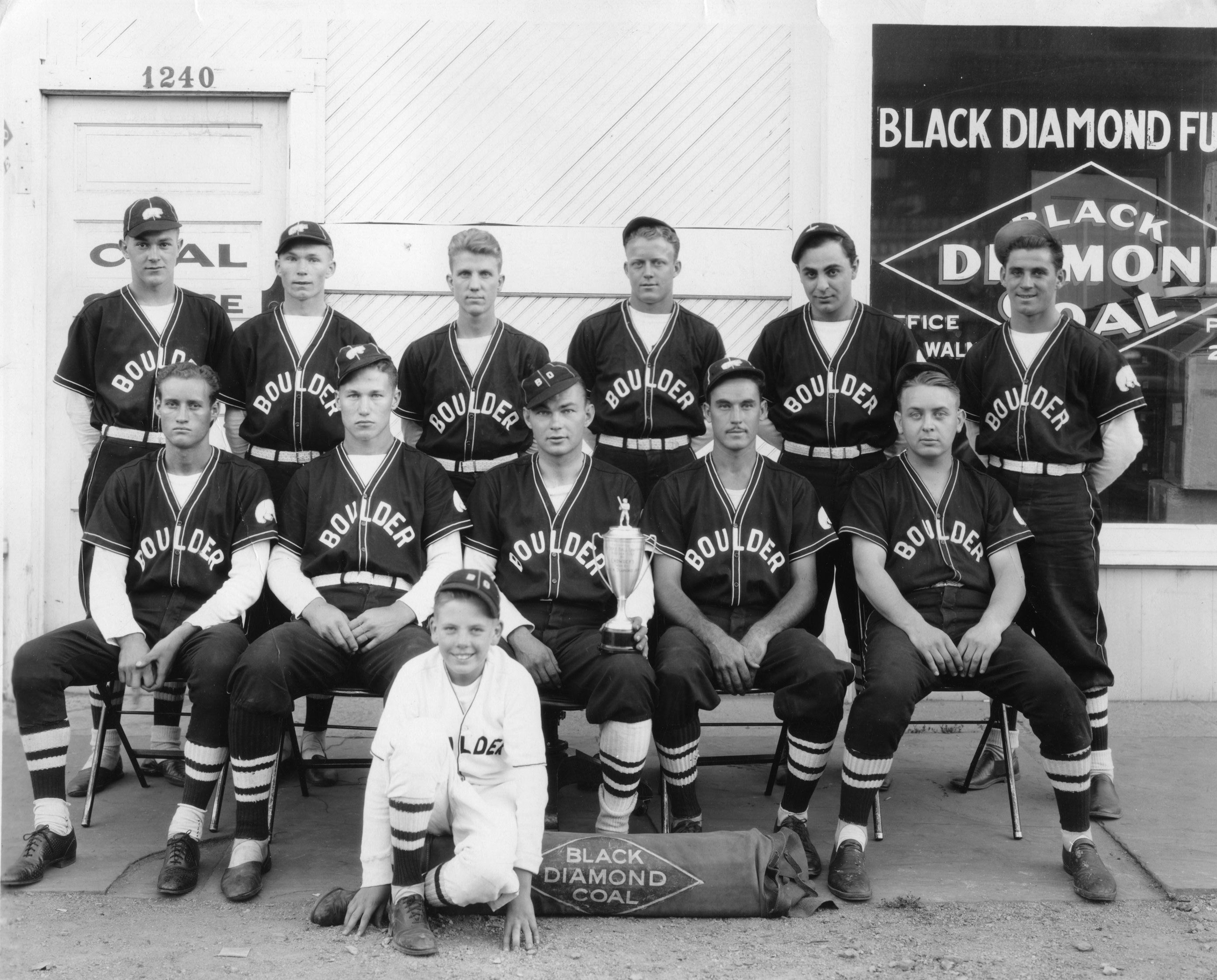 Black Diamond Coal Company team, Boulder, 1936. Back row, from left: unknown, Landon Persons, Roy Brover, John Earl, Bauldie Moschetti, John Ultschi. Front row, from left: Bud Keeter, Byron “Wizzer” White, Merle Lefferdink, unknown, Bill Carkeek. Batboy: Bill Carkeek’s nephew.