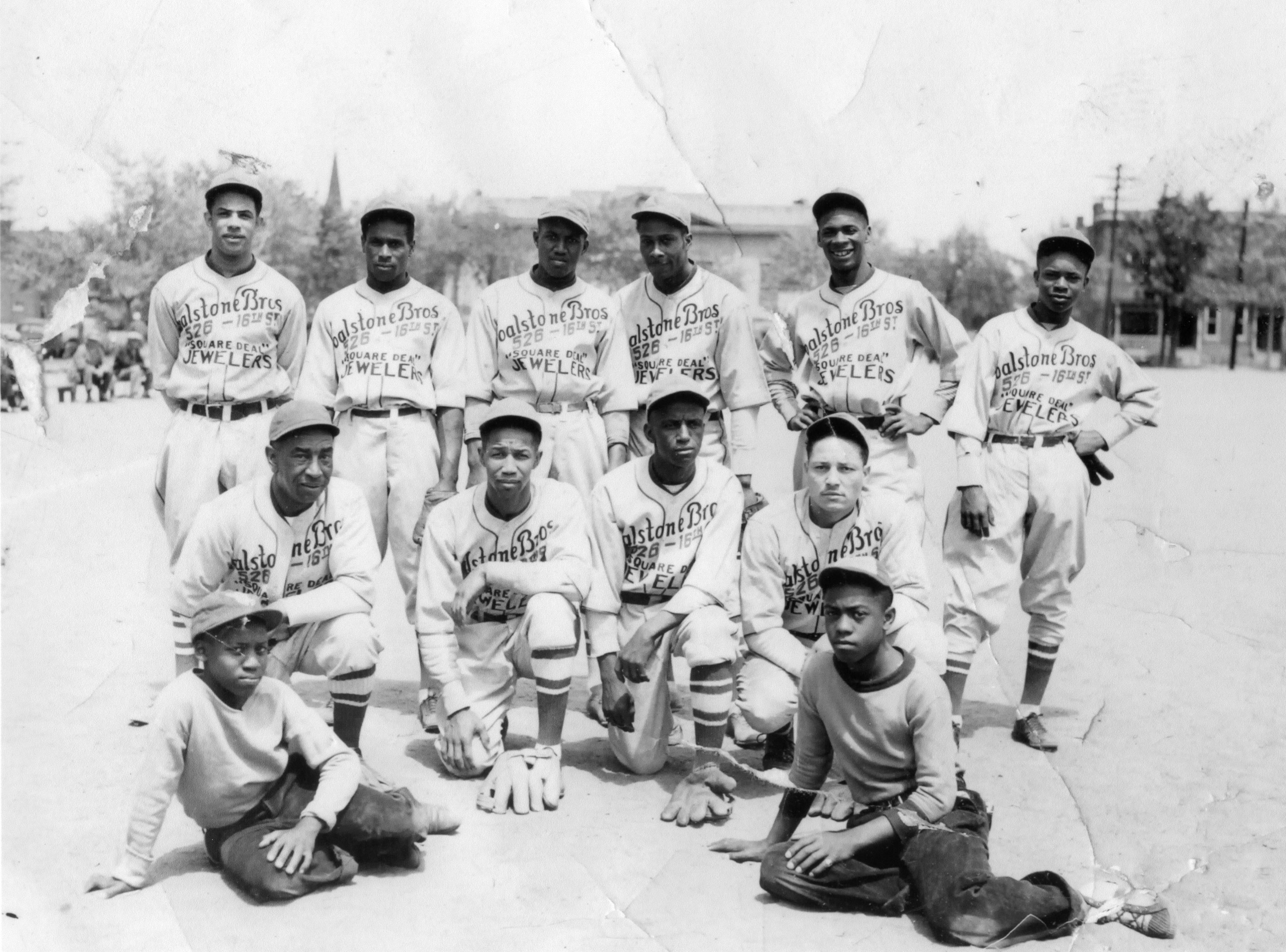 Goalstone Brothers Jewelers was owned and operated by Joseph Goalstone. Born in New York in 1890, Joseph was the son of Russian Jewish immigrants Moshe Leib (Louis) and Sarah Genovich (Goalstone). Around 1910 the Goalstone family—including Joseph and his eight siblings—settled in Denver, where Louis worked as a butcher. In the late 1920s Joseph entered the jewelry business, working first as a diamond broker before operating his own stores. The team’s jerseys read, “Goalstone Bros. 526 16th Street ‘Square Deal’ Jewelers.”