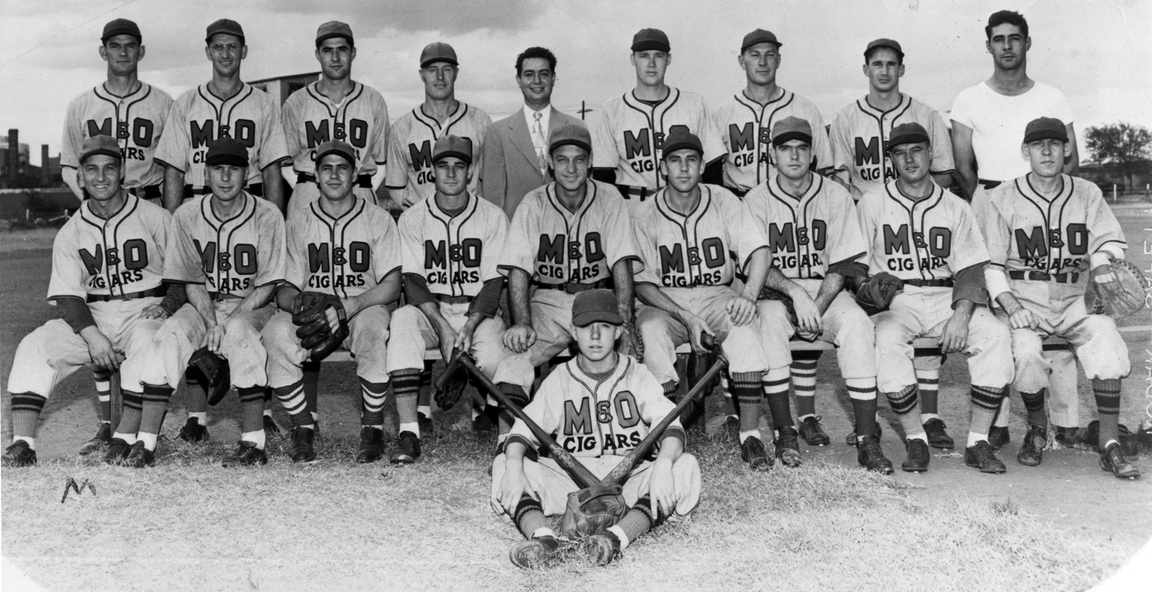 1946 Colorado champions in the Victory League, M&O Cigars team, Denver. Back row, from left: Lee Grissom (pitcher and major league player), Art Unger (left field), Bob Cairns (first base), Dick Hotton (third base), Sam Leornson, Bob Petersen (pitcher), Beau Bell (right field and major league player), Darrell Gessert (pitcher), Ray Cairns (utility). Front row, from left: Jim Garramone (manager and former manager of the Coors Brewing team), George Anderson (shortstop), Bob Justman (utility), Al Kavanagh (pitcher), Jim Queen (catcher), Gene Ater (second base), Jim Conboy (pitcher), Leonard “Lefty” Hawkins (center field), Bennie Pister, Ron Garramone (bat boy and son of manager Jim Garramone). Courtesy Robert Garramone, History Colorado CIAPA Collection. PCCL5937