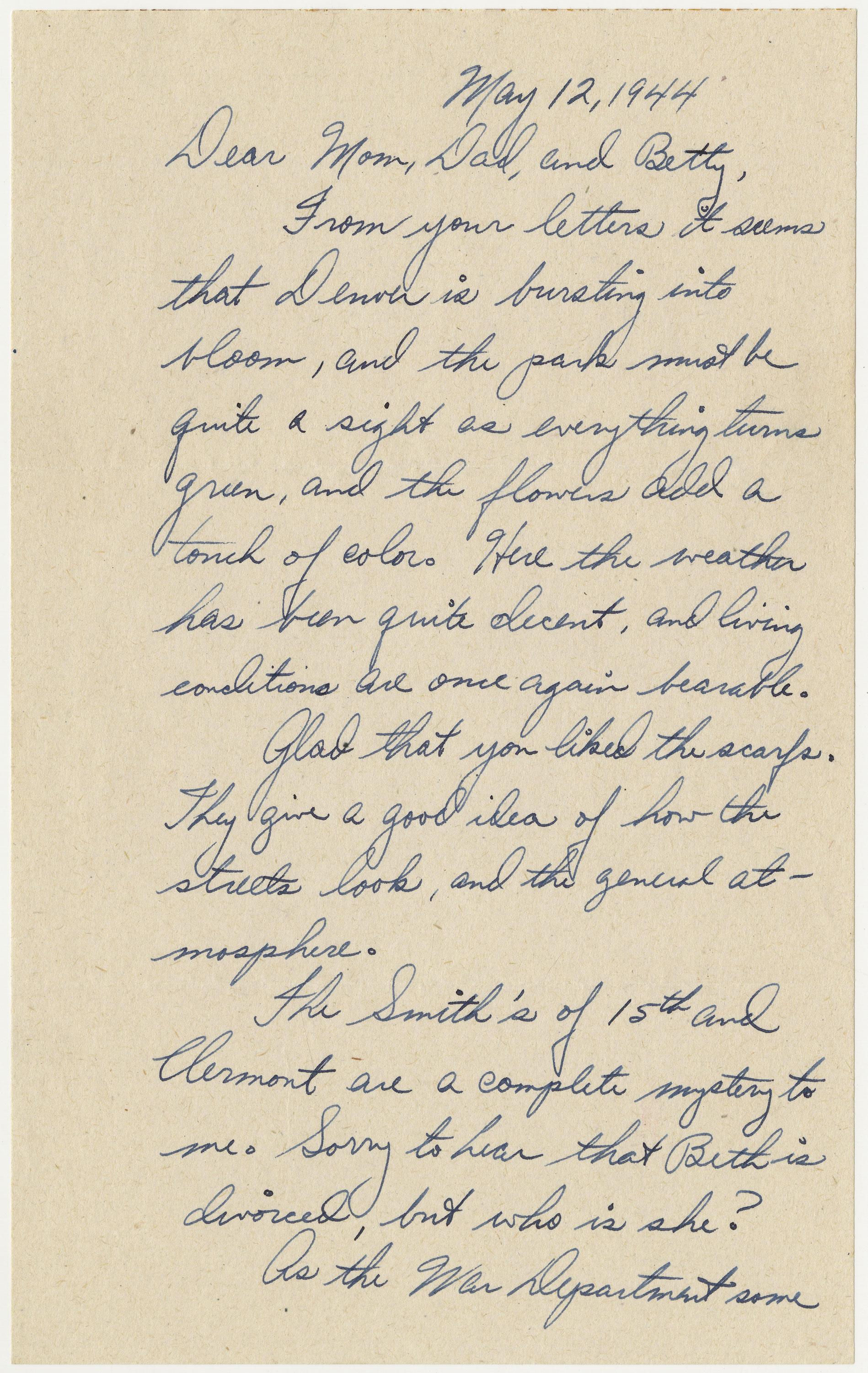 From your letters it seems that Denver is bursting into bloom, and the park must be quite a sight as everything turns green, and the flowers add a touch of color. Here the weather has been quite decent, and living conditions are once again bearable. . . .
