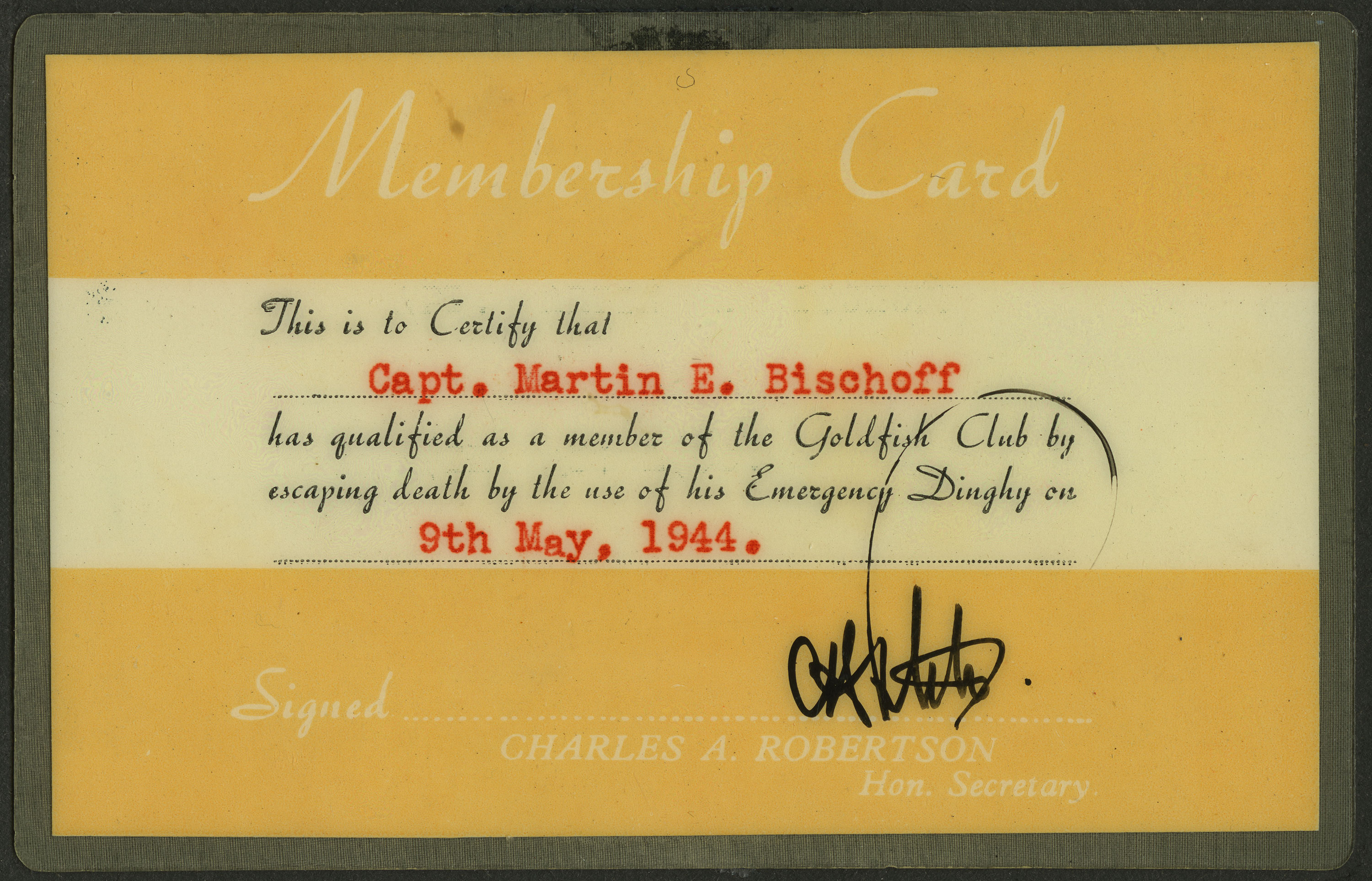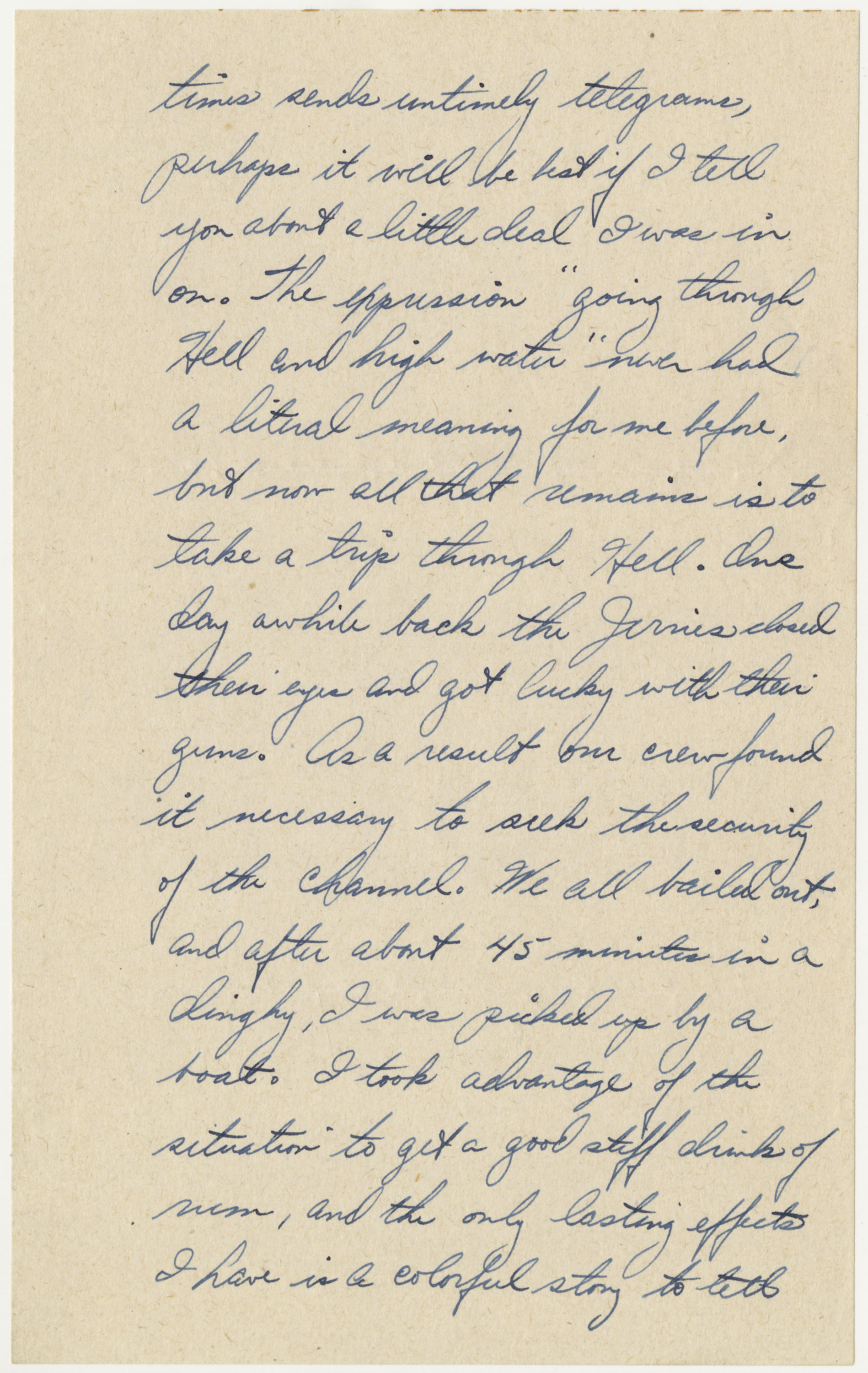 As the War Department sometimes sends untimely telegrams, perhaps it will be best if I tell you about a little deal I was in on. The expression “going through Hell and high water” never had a literal meaning for me before, but now all that remains is to take a trip through Hell. One day awhile back the Jerries closed their eyes and got lucky with their guns. As a result our crew found it necessary to seek the security of the Channel. We all bailed out, and after about 45 minutes in a dinghy, I was picked up by a boat. I took advantage of the situation to get a good stiff drink of rum, and the only lasting effects I have is a colorful story to tell your grandchildren. . . .