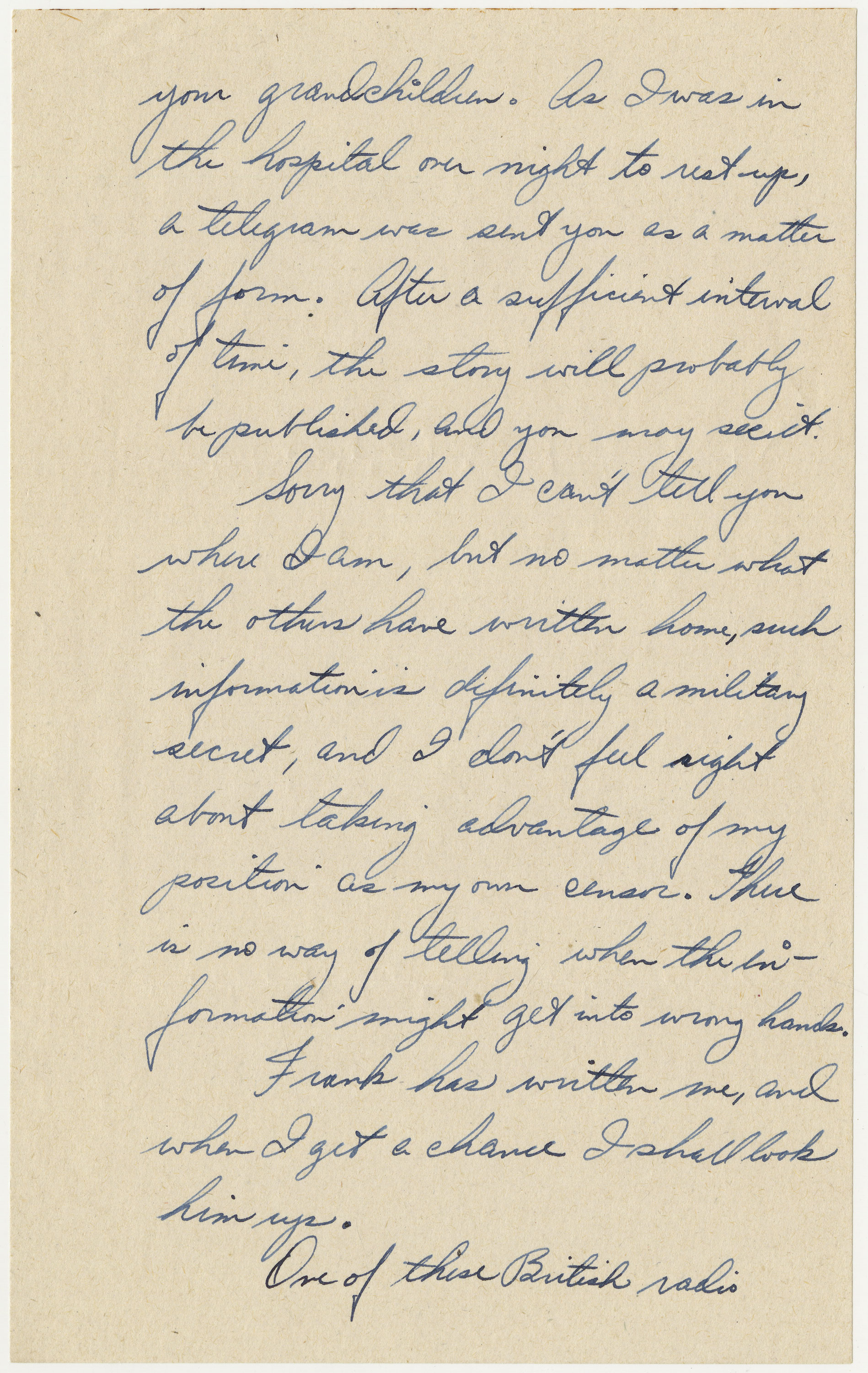 Sorry that I can’t tell you where I am, but no matter what the others have written home, such information is definitely a military secret, and I don’t feel right about taking advantage of my position as my own censor. There is no way of telling when the information might get into wrong hands. . . .