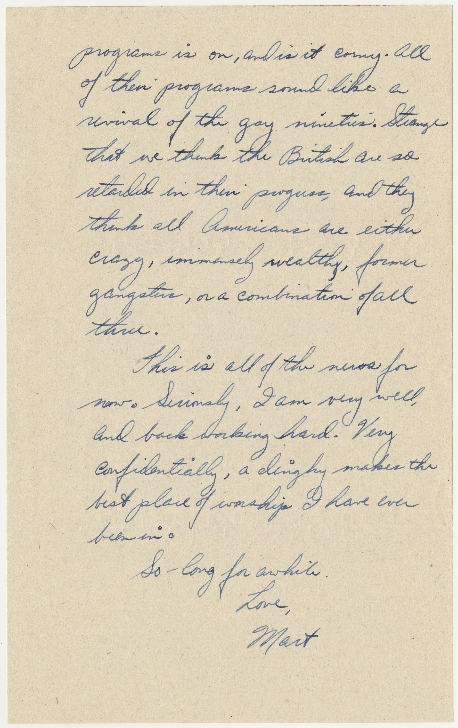 One of these British radio programs is on, and is it corny. All of their programs sound like a revival of the gay nineties. . . . [T]hey think all Americans are either crazy, immensely wealthy, former gangsters, or a combination of all three.