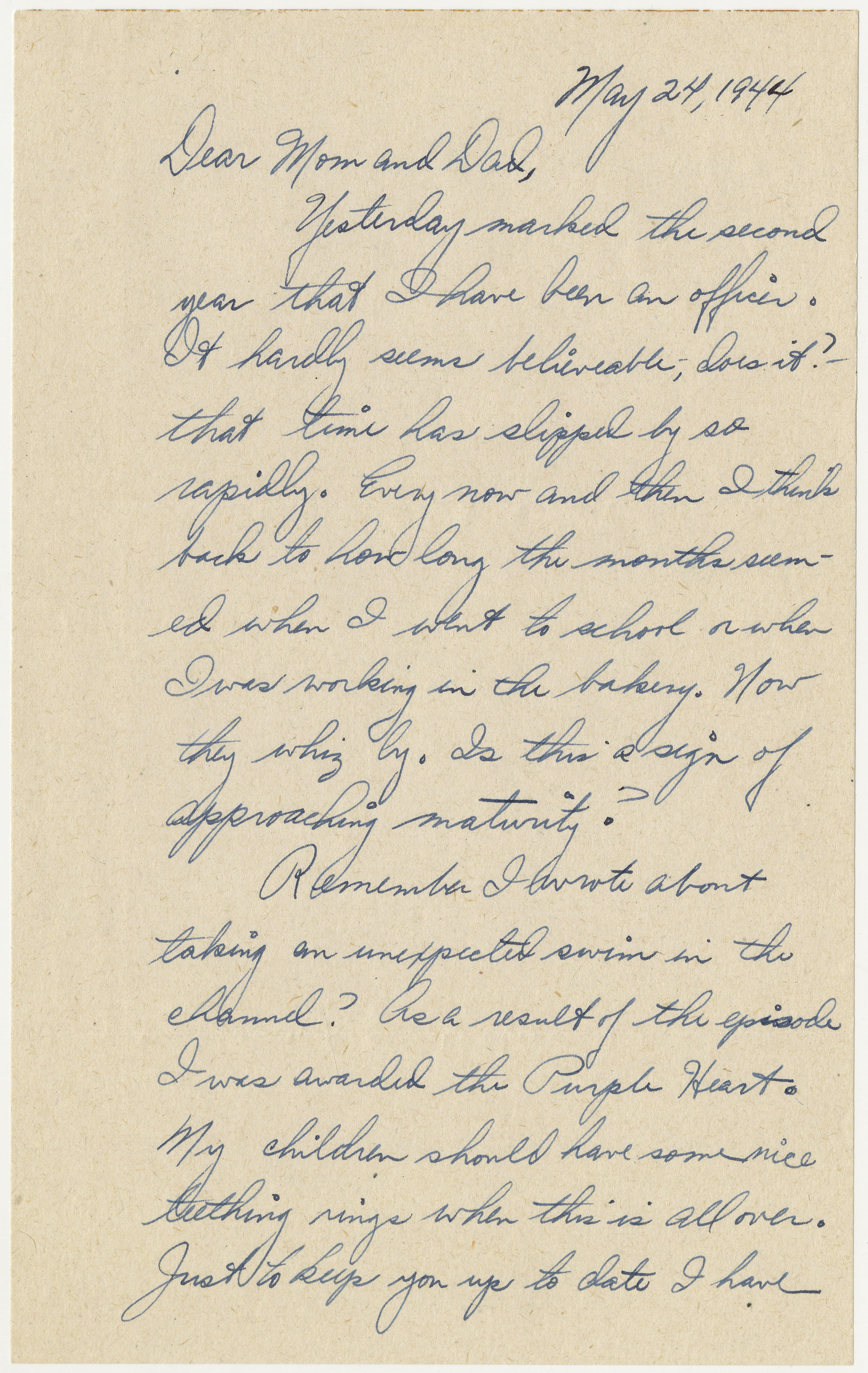 Among the many pieces of correspondence available to researchers at the Hart Library are the letters of Martin Bischoff (Mss. 01509), who wrote home to his family from England during World War II. Here, Martin—somewhat casually—tells his family of a disaster in the English Channel that would earn him the Purple Heart.