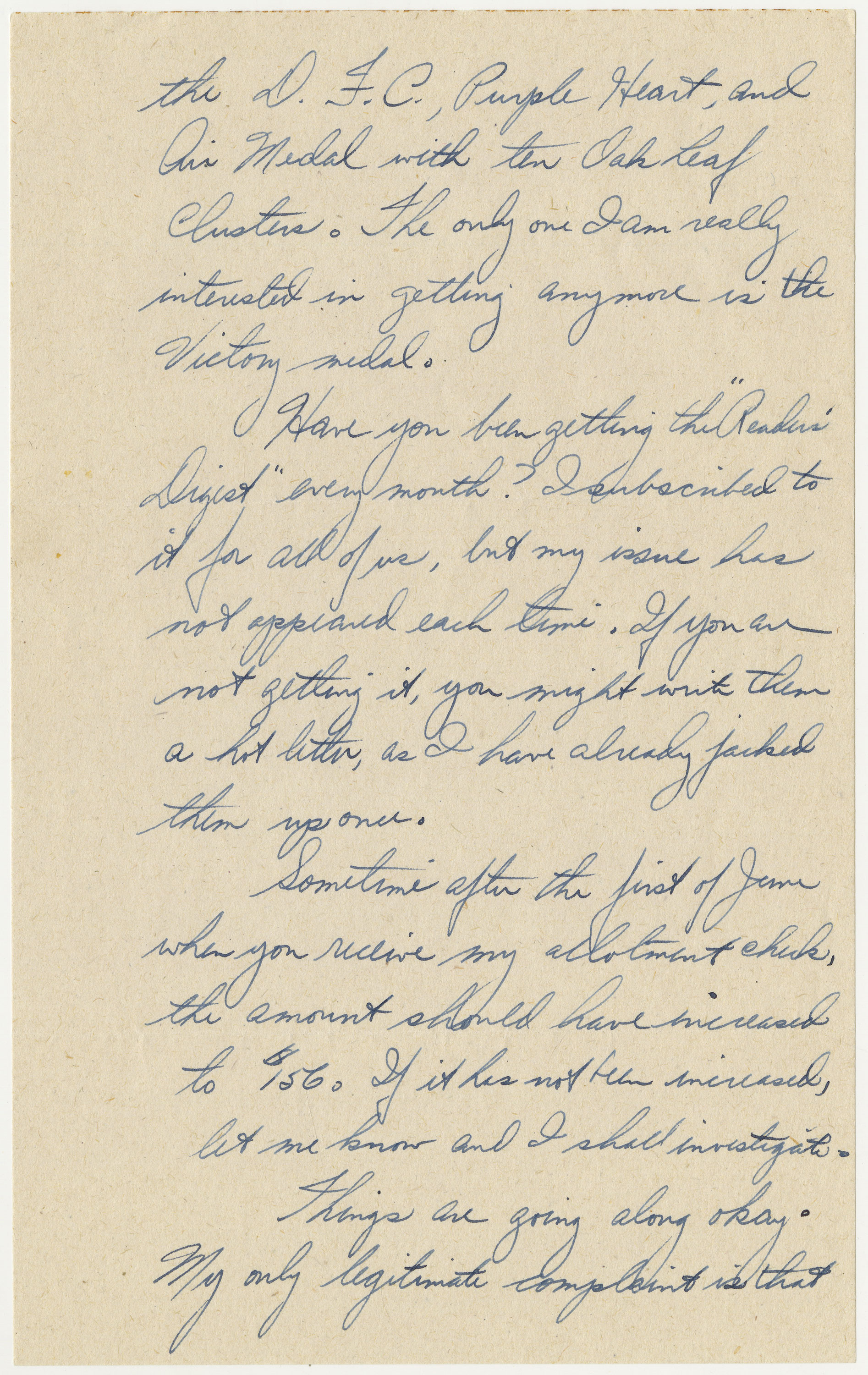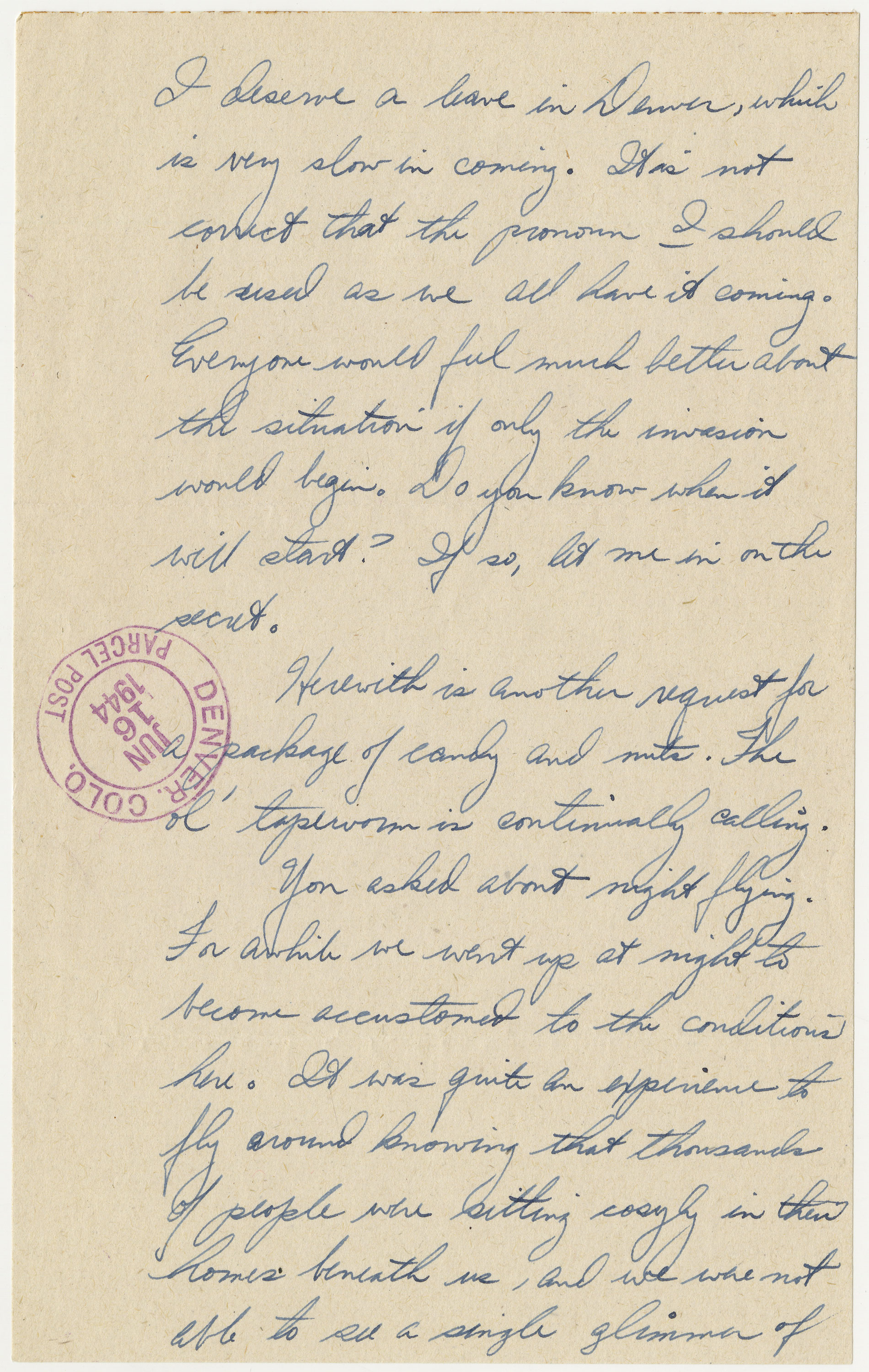 Things are going along okay. My only legitimate complaint is that I deserve a leave in Denver, which is very slow in coming. It is not correct that the pronoun I should be used as we all have it coming. Everyone would feel much better about the situation if only the invasion would begin. Do you know when it will start? If so, let me in on the secret.
