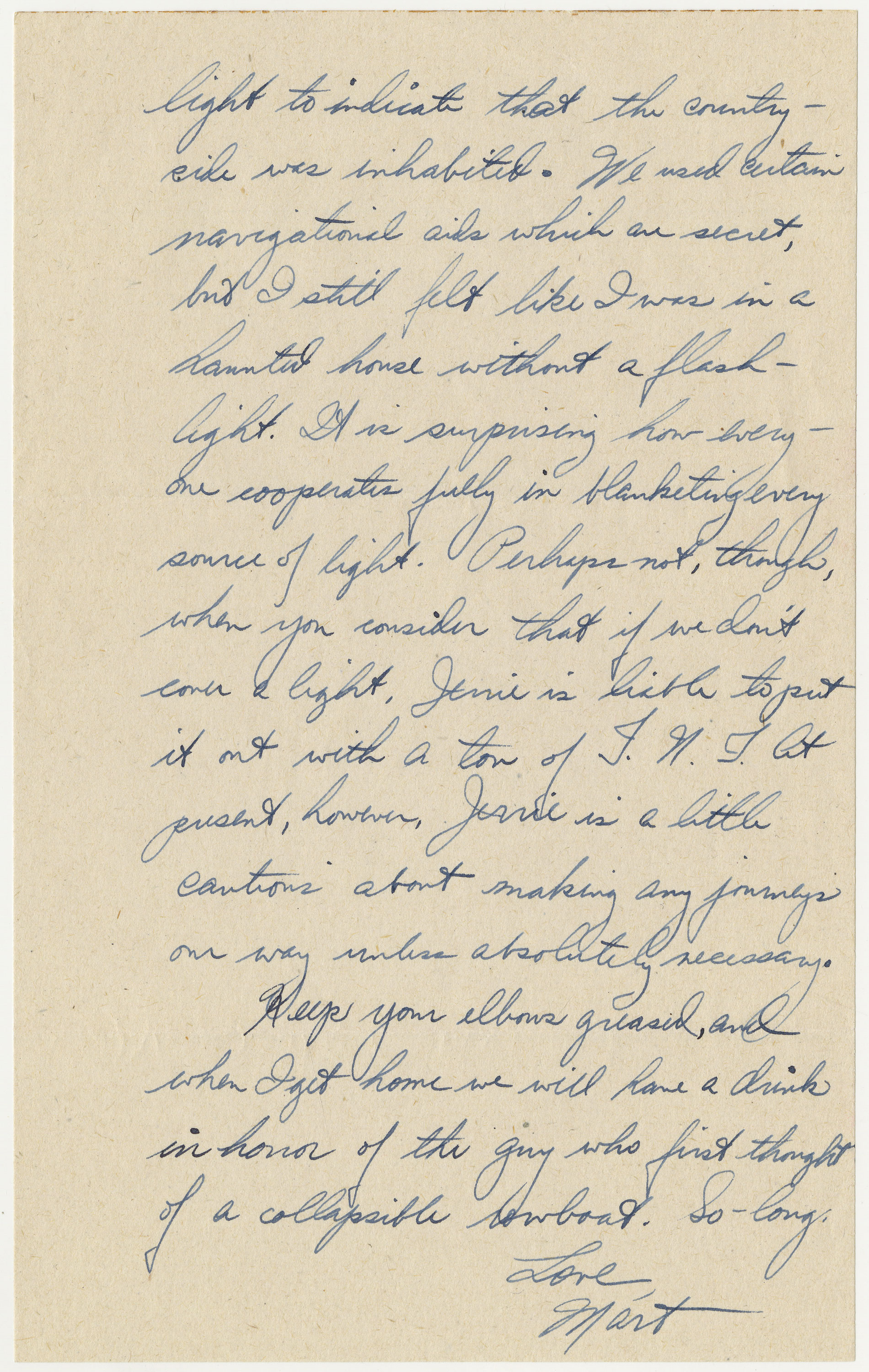 You asked about night flying. For awhile we went up at night to become accustomed to the conditions here. It was quite an experience to fly around knowing that thousands of people were sitting cosyly [sic] in their homes beneath us, and we were not able to see a single glimmer of light to indicate that the countryside was inhabited. We used certain navigational aids which are secret, but I still felt like I was in a haunted house without a flashlight. It is surprising how everyone cooperates fully in blanketing every source of light. Perhaps not, though, when you consider that if we don’t cover a light, Jerrie is liable to put it out with a ton of T.N.T. At present, however, Jerrie is a little cautious about making any journeys our way unless absolutely necessary.