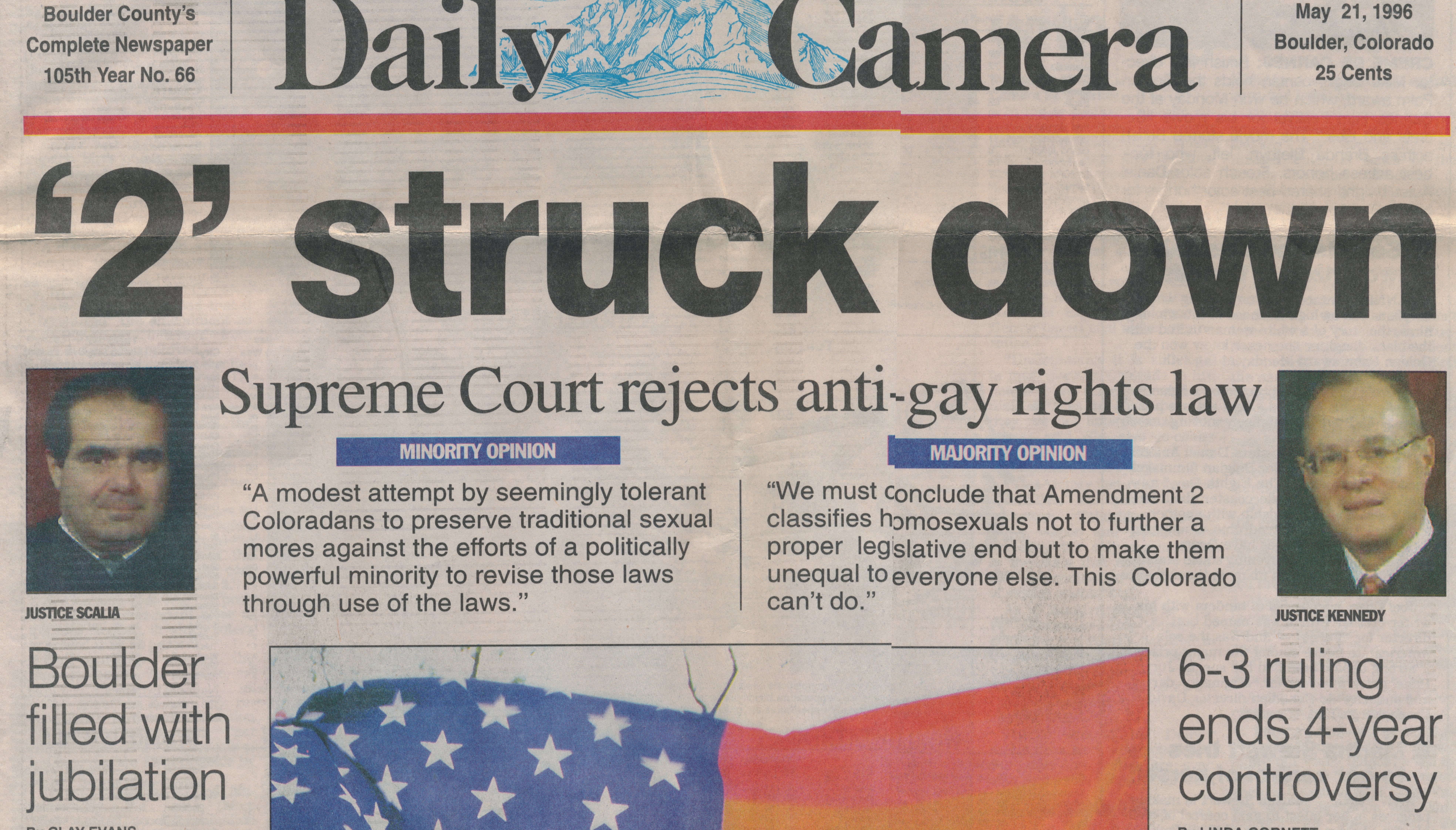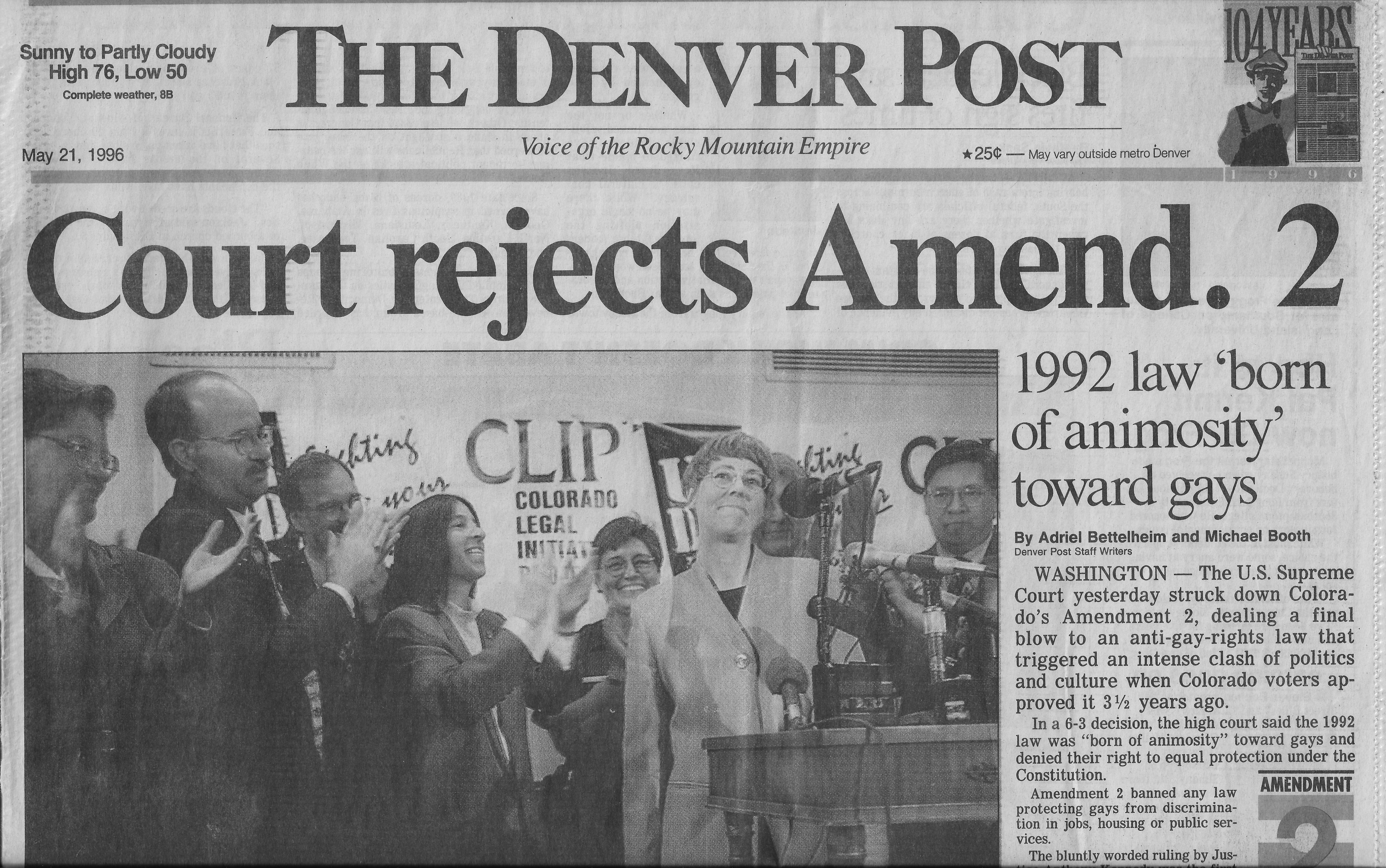 Boulder’s Daily Camera on May 21, 1996, announced the U.S. Supreme Court’s verdict overturning Amendment 2. The city’s mayor, Leslie Durgin, had attended the Court proceedings in person.