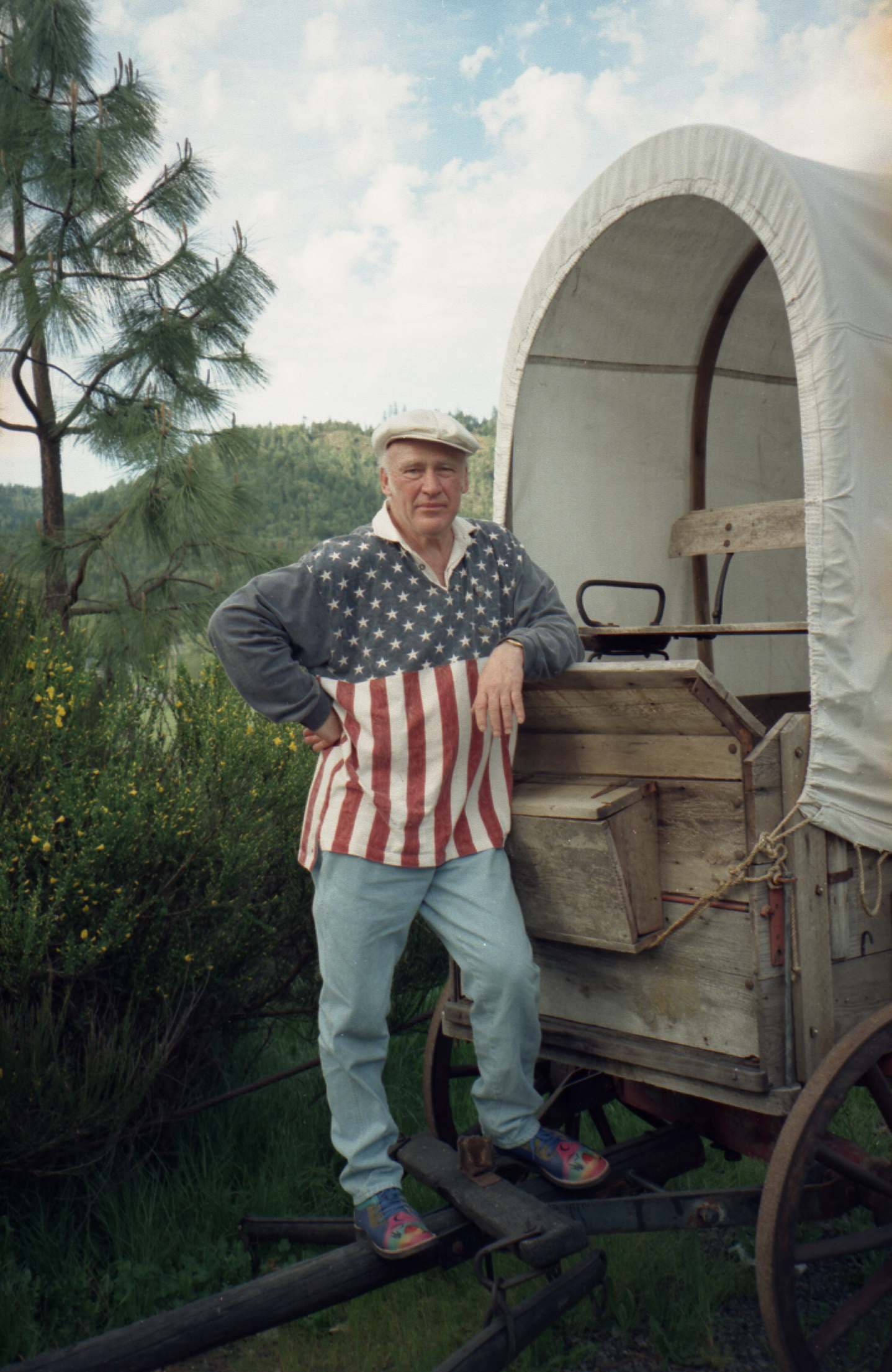 Photo of a man standing on the front hitch of a wooden covered wagon that is outdoors, surrounded by green shrubs and trees. He is wearing brightly colored shoes, blue jeans, and a white flat cap. His casual, rugby-style shirt represents the American flag: the top half of the shirt is blue with white stars, while the bottom half is red and white vertical stripes, and the collar is white. He is leaning his left elbow on the wagon and he is looking at the camera.