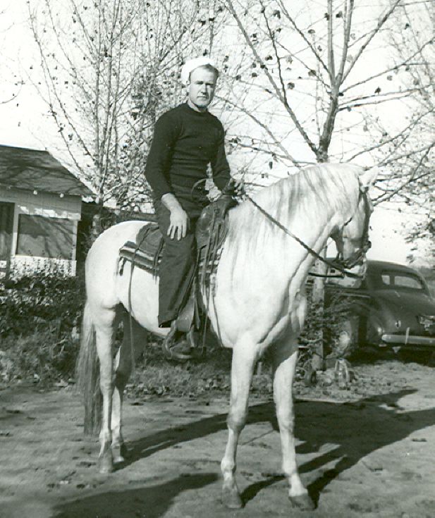 Photo of a man in black trousers and a black shirt with what looks like a white sailor-style hat, sitting atop a white horse. The horse is standing under some trees which are in front of a small house. A car is parked nearby in this vintage black and white photo.