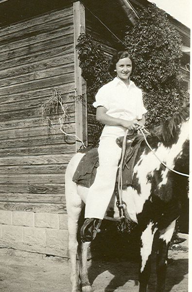 Photo of a dark-haired woman sitting atop a horse with the reins in her hands. The horse is standing in front of the corner of a small building with wooden siding and vines growing up one side of the structure. She is looking to the right of the image, and smiling. She is wearing a light-colored, short-sleeved blouse and light-colored trousers in this historic image.
