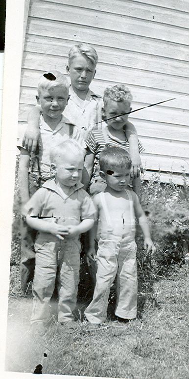 Photo of five young boys, standing together for a portrait in front of a white building with wooden siding. The tallest boy is in the back, with his arms over the shoulders of the next two tallest boys. In front are the two youngest boys. It is a sunny day, and the weather is warm because the boys are wearing short-sleeved shirts and trousers, or no shirt at all, in the case of one young boy in the front.