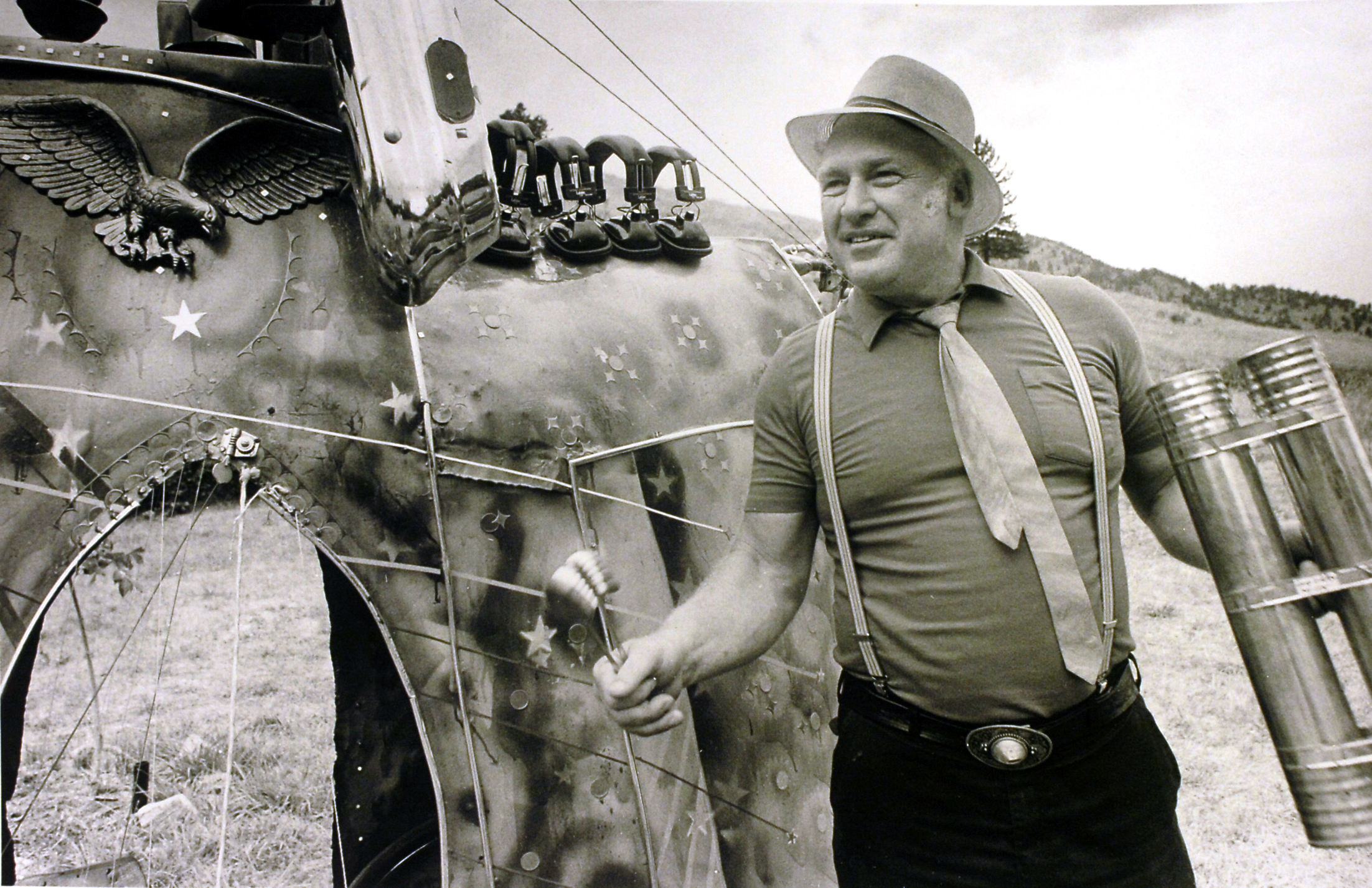 Photo of a man wearing jeans, suspenders, a short-sleeved t-shirt, and light-colored fedora hat, holding a long tubular metal object in his left hand, and a noisemaker of fake teeth in his right hand. He is standing in front of a large metal object, painted with stars. An 3-D eagle emblem is attached to the contraption on the left side of this image. The man is looking to the left and smiling.