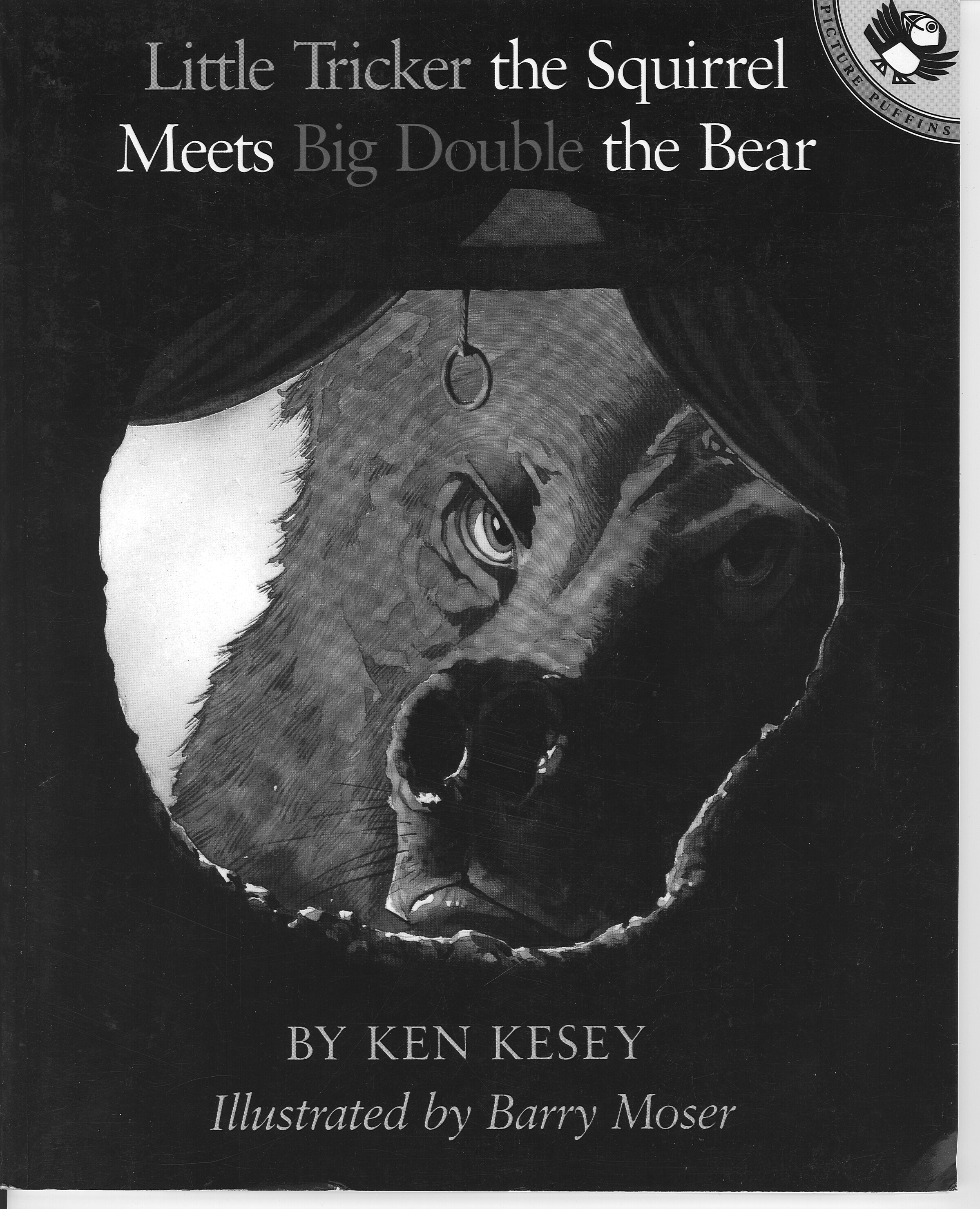 Image of the cover of the children's book, Little Tricker the Squirrel Meets Big Double the Bear, by author Ken Kesey. Illustrated by Barry Moser. The cover of the book features the illustration of a frustrated bear, looking into the hole of a tree trunk, that is someone's home. The hole has curtains which are pulled back to each side, and the pull ring of a roller blind is hanging down.
