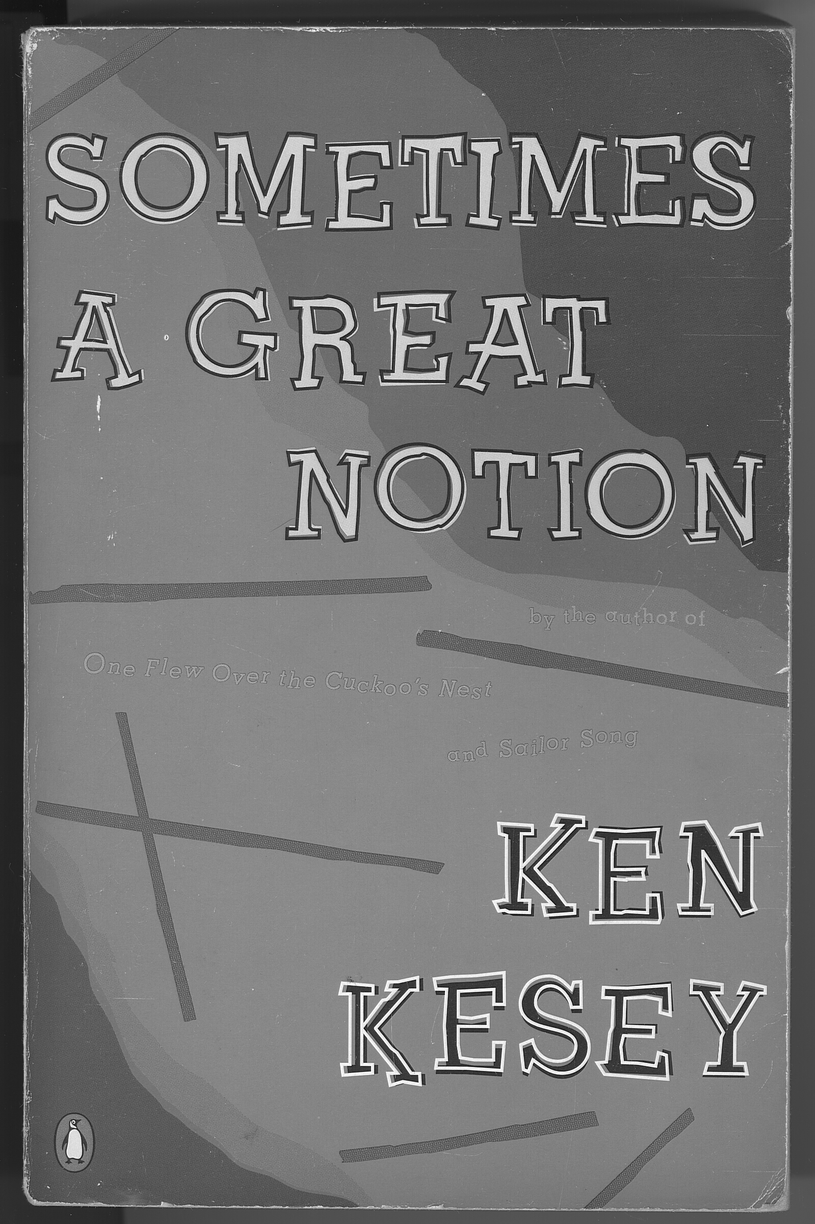 Image of the cover of the book, Sometimes a Great Notion, by Ken Kesey. The cover has different