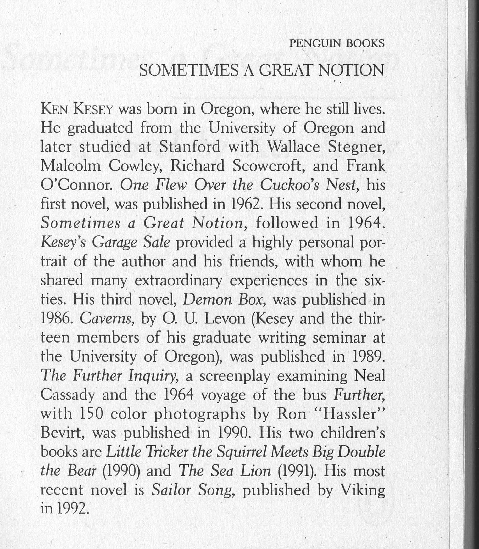 Photo of a page from the novel Sometimes a Great Notion, by author Ken Kesey. The page features the author's biographical information, including the mention that he was born in Oregon, which is incorrect. Kesey was born in La Junta, Colorado.