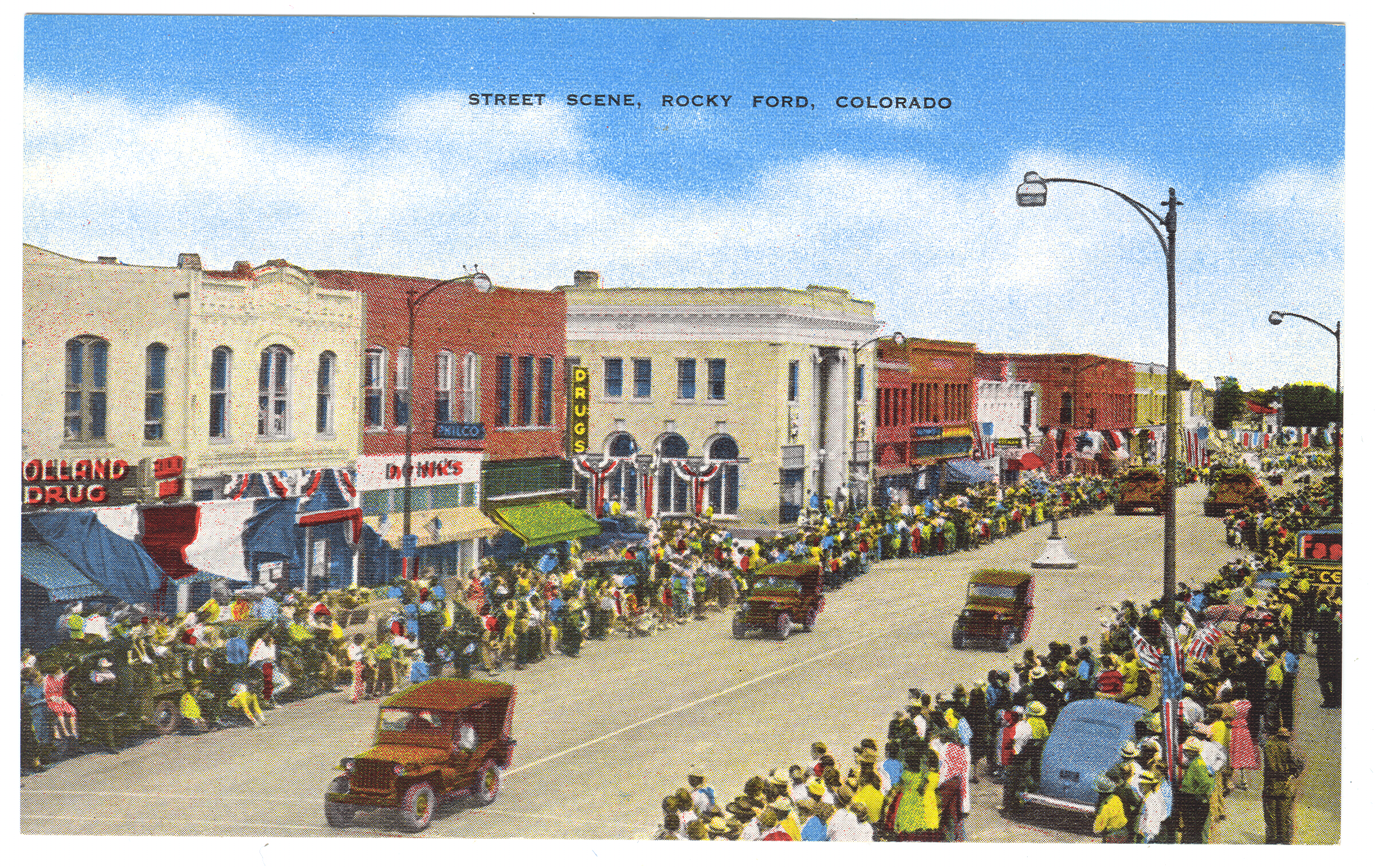Image of a historic postcard showing a Fair Day parade in the 1940s in Rocky Ford, Colorado. Colorful crowds of spectators line the streets as jeeps roll by. Buildings are decorated in red, white, and blue banners and half-round buntings. American flags are also on display.