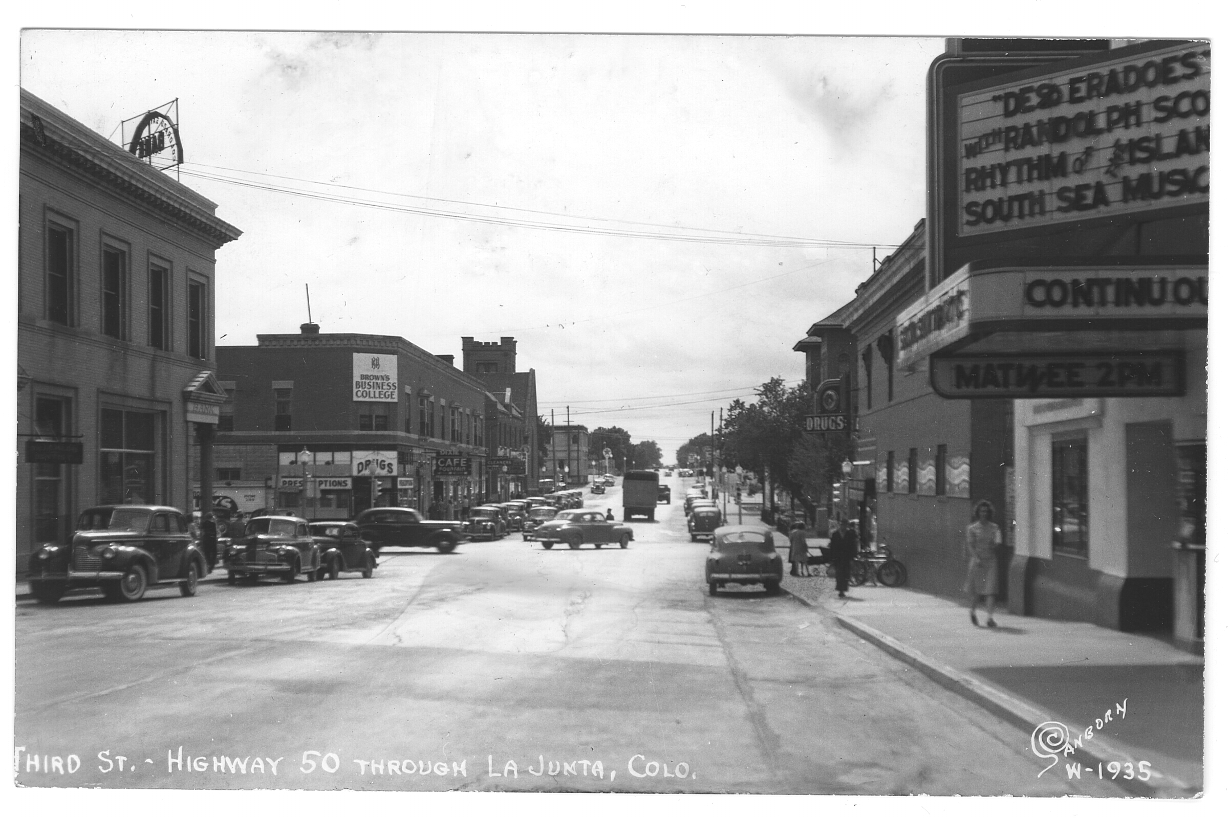 Photo of the downtown area of a smaller town, taken around the early 1940s. The street is wide, and cars are driving down the road while some are parked along both sides of the streets. Signs on one building to the left of the image says "Drugs" and "Prescriptions" while the upper floor sign says "Business College." To the right of the image, there is a theater in the foreground, advertising a matinee at 2pm and the films playing  include "Desperadoes" and "Rhythm of the Islands."