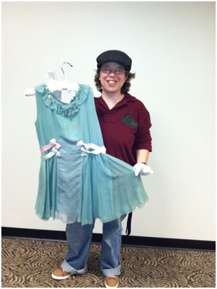 Standing in the storage space of rolling racks filled with soft garment bags, I briefly wondered about the history of theses items, who wore them, where they came from, and how they’d survived. Each rack contained a small time capsule of an era: the modest styles worn by women in the 1860s while presenting themselves in public to what they relaxed in at home, progressing to the fun and creativity of evolving styles of the 1950s and 60s. One thing that struck me was how sizing differed from today’s apparel items. Women in days gone by were seemingly much smaller and petite by 21st century standards, their garments ranging from almost child-sized to a present-day size 0–2.