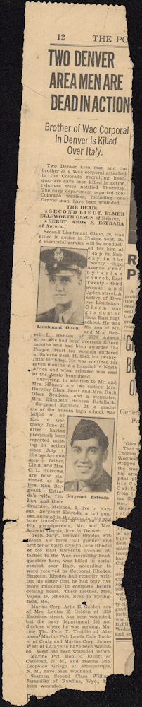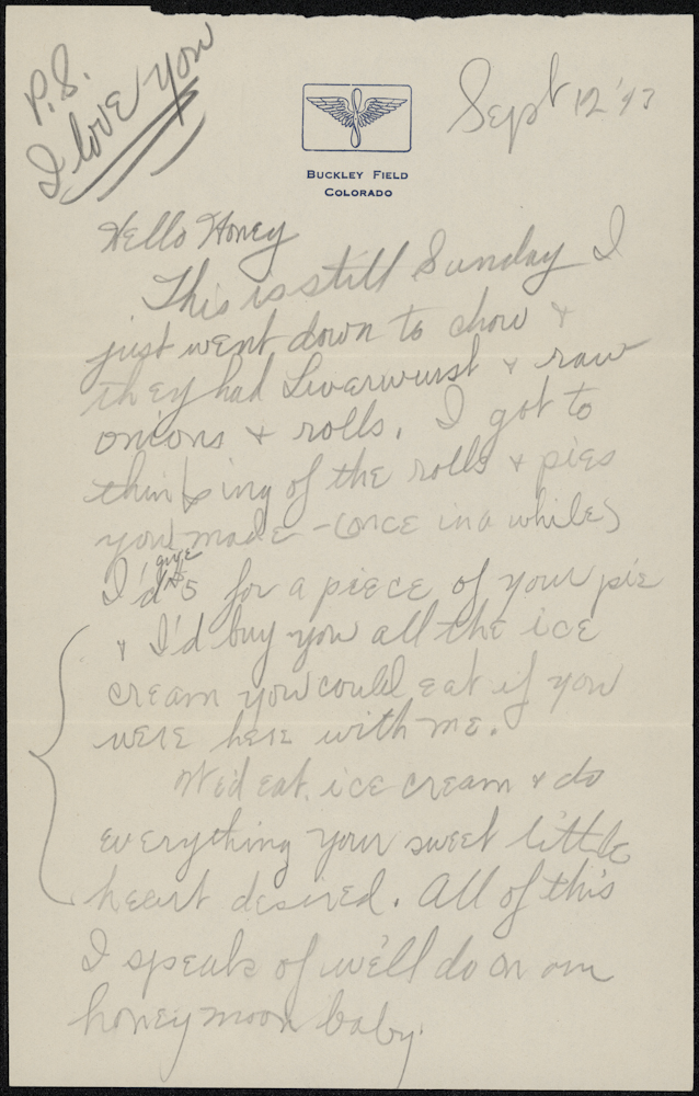 History Colorado has the collection (donated by his daughter, Melinda) that follows Estrada through his time in the U.S. Army Air Force Corps. This very personal collection poignantly tells—through letters, documents and photos—the story of a soldier’s love for his family and fear of losing his wife. Estrada writes, poetically, “At night I lay in bed and look out at the stars and [it] seems like I can walk on them straight to you….” He can’t wait to return to the life in which he and Lillian will “Sleep late, have pancakes for breakfast...and go for a long walk.” The collection concludes with the Western Union telegram notifying Lillian that Amos was killed in action.