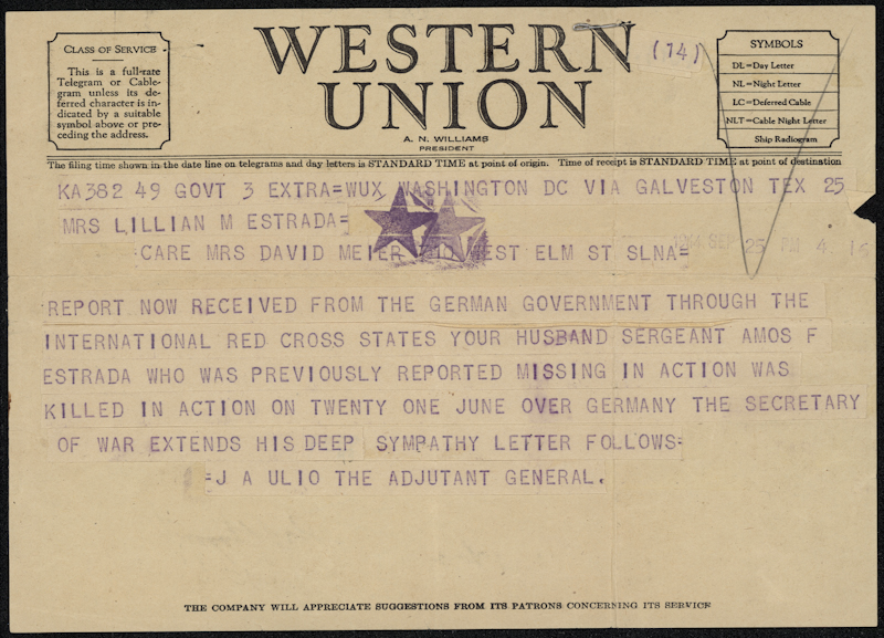 Imagine hearing a knock on the door and being handed a Western Union telegram notifying you that your husband, son or child has been killed in action. For those left behind during World War II, a telegram was the epitome of tragedy, and that’s what Lillian, the wife of Sergeant Amos F. Estrada, received on September 25, 1944.
