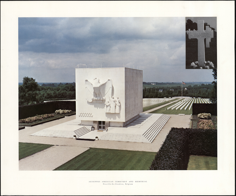 The date and locale of his death were hardly enough consolation, so Lillian sought more information. She received letters from his crew, detailing the events leading up to the day they abandoned the plane, but no one knew what had become of him. It wasn’t until the end of the war that the War Department translated the captured German records that identified Estrada as a crewman killed while parachuting from the damaged Flying Fortress that crashed at 9:35 a.m. on June 21 near Stolzenburg. Records indicate that Estrada’s body was buried at 6 a.m. on June 22 in the community cemetery, but was later moved to Ardennes American Cemetery in Neupre, Belgium.