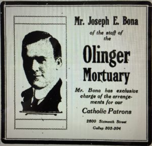 Olinger Mortuary advertisement featuring Joseph Bona.