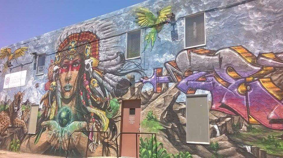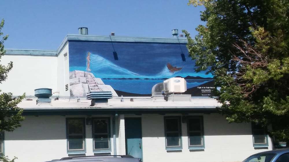 "Denver artist Jerry Jaramillo has been painting murals since the 1970s. The work of author Carlos Castaneda inspired this mural, which depicts an Aztec eagle dancer. Currently this mural sits on top of the Aztlan Recreation Center."