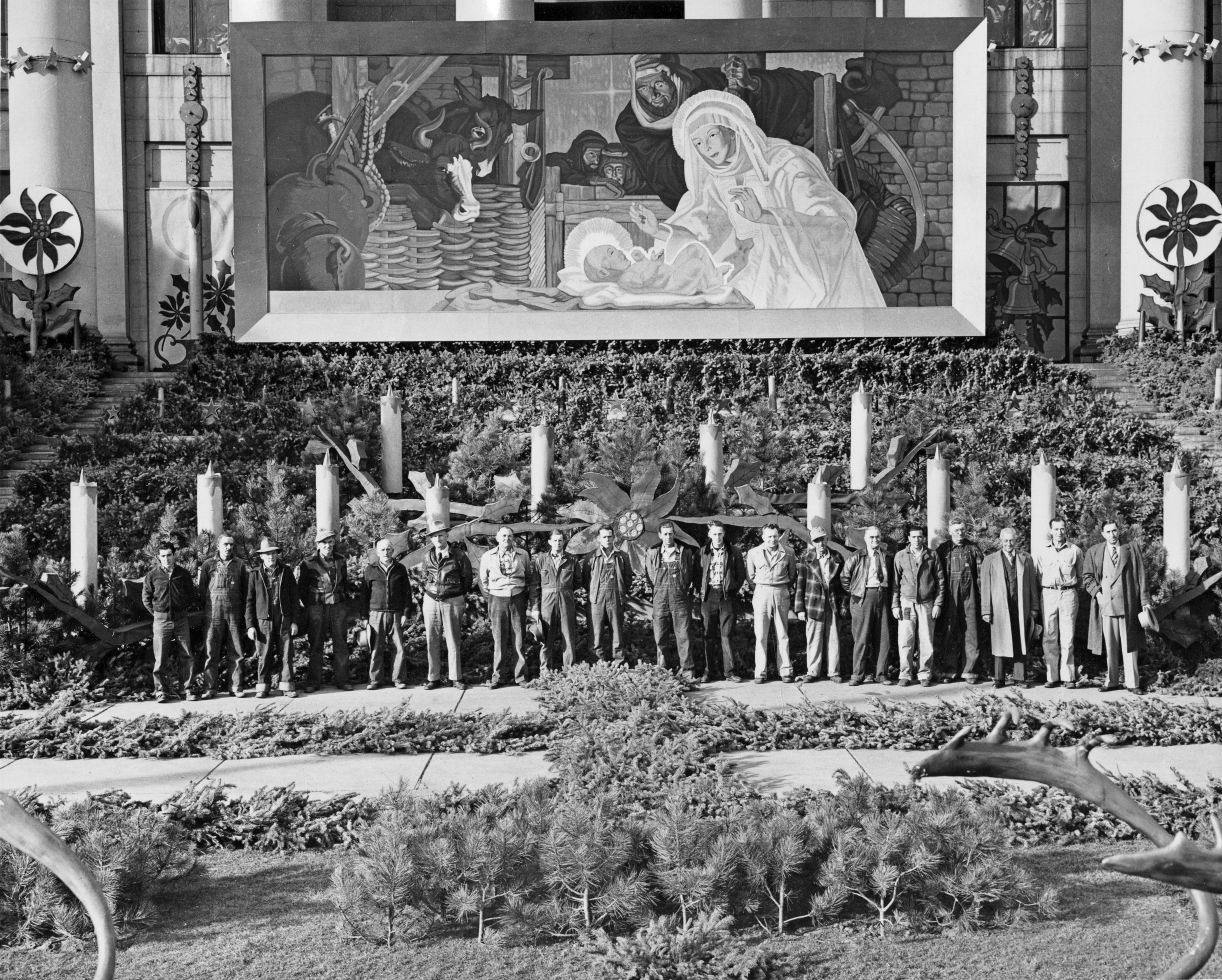 For twenty-nine years John improved his exhibit by adding more garlands one year, new bulbs another, and additional figures, flowers, and even paintings the next. When he retired in 1956, the display included an eighty-five-foot artificial tree, handmade reindeer, candles, giant poinsettias, 25,000 bulbs, seventeen miles of electrical wiring, and twelve tons of evergreen boughs.