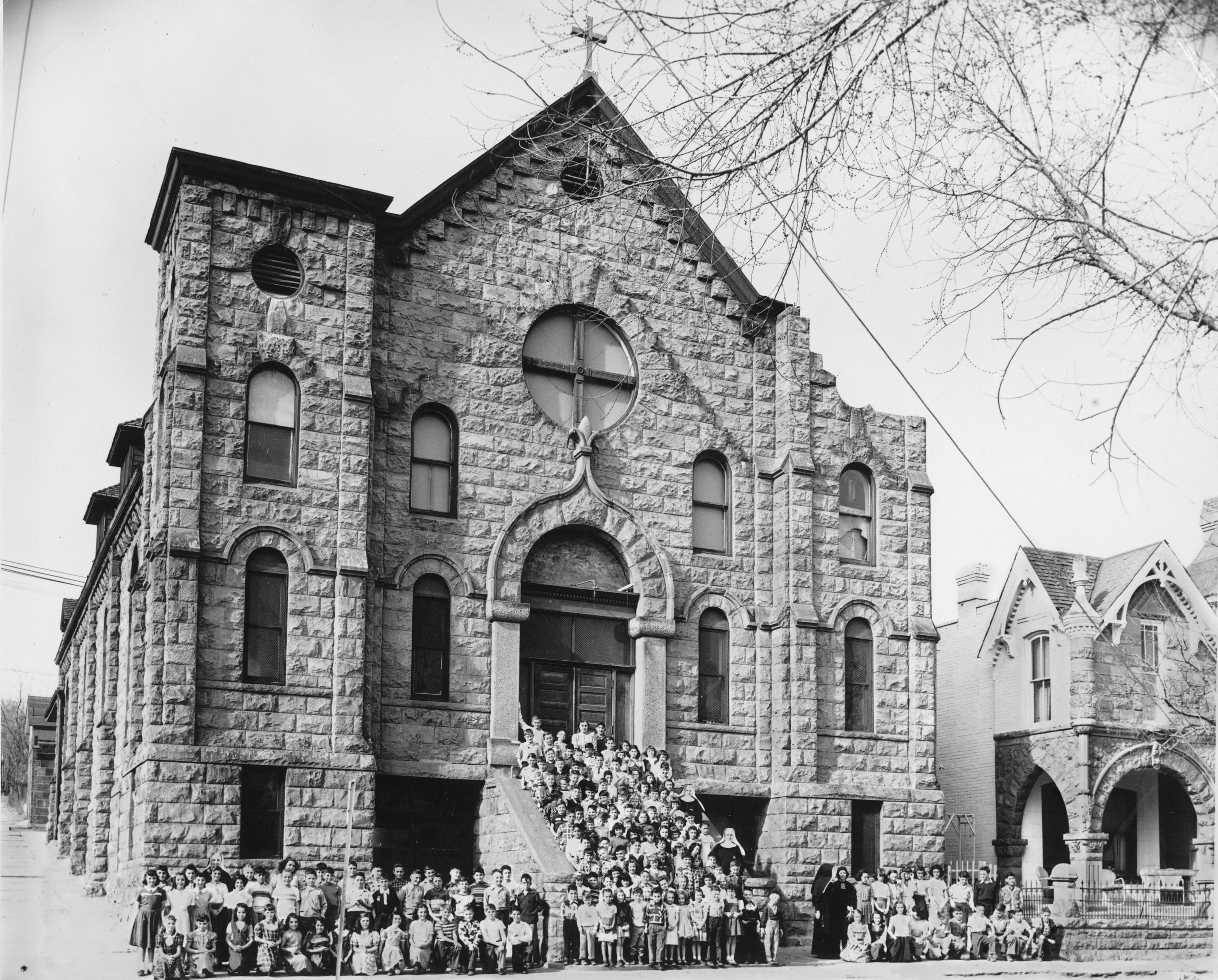 Mount Carmel Parish School Denver with Damascio house at right, by Van's Studio, 1945