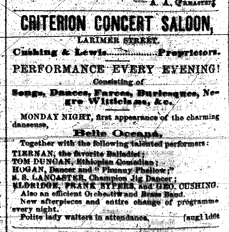 This Rocky Mountain News clipping from August 14, 1862 lists Samuel S. Lancaster as a champion jig dancer performing at the Criterion Concert Saloon.