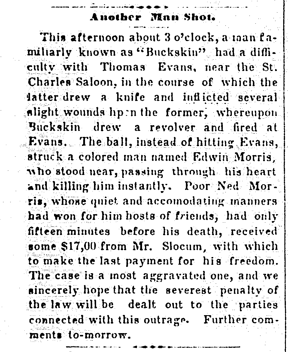 Edwin “Ned” Morris had the great misfortune of dying minutes after getting the funds to buy his freedom in 1861. It was a stray bullet from a brawl outside Denver’s St.Charles Saloon that took his life, spurring the Rocky Mountain News to write, “We sincerely hope that the severest penalty of the law will be dealt out to the parties connected with this outrage.” The accused culprit “Buckskin” Mark Widgenstein was acquitted nine days later.