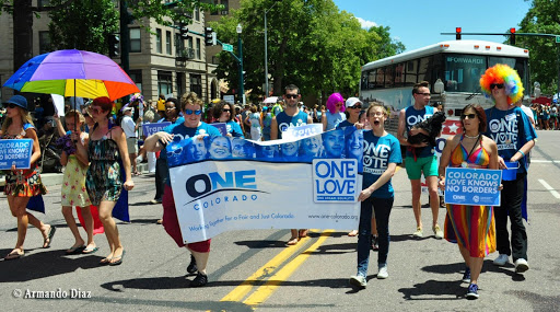 The author on the right, holding the One Colorado banner during Colorado Springs Pride Parade 2012.