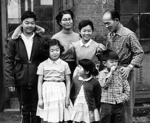 The Ozaki Family on Larimer Street. Top row: Joe, Tamiye, Martha, and Joe. Bottom row: Hiromi, Nancy, and Charles.