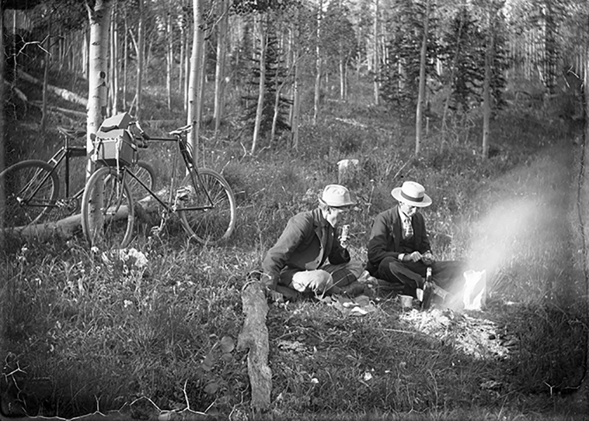 Fred Payne Clatworthy and a member of the Jackson family have breakfast near Pikes Peak on way to Cripple Creek, July, 1898. Accession number: 99.164.240.